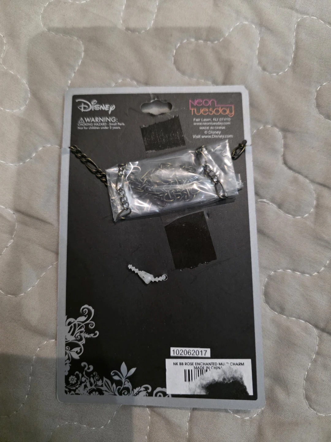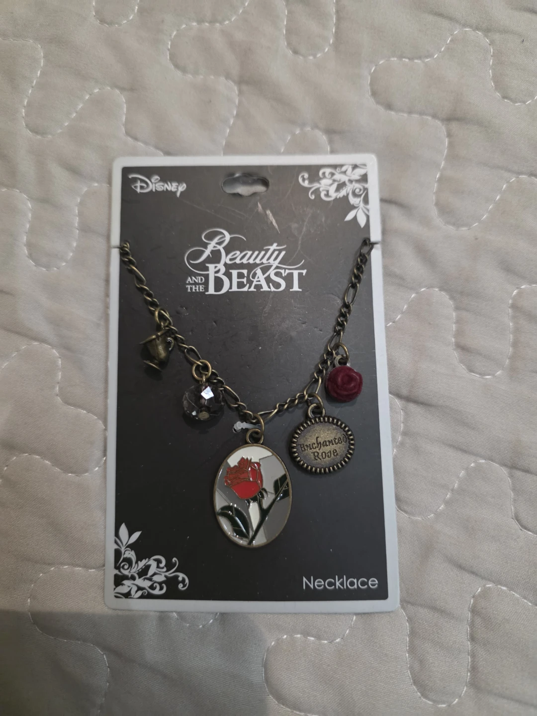 This is a brand new, still in package Disney Beauty and the Beast Enchanted Rose multi-charm necklace! It's a cute necklace with a rose pendant and other charms from the movie.