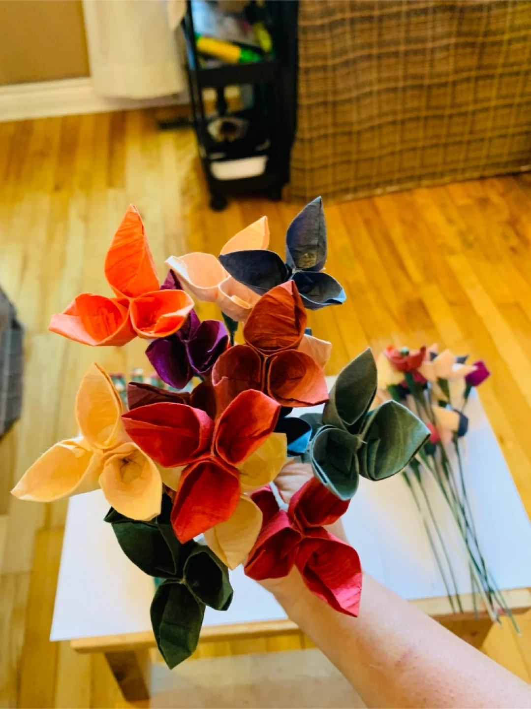 NEW ONE-OF-A-KIND Handcrafted flower petals and buds using craft paper. Twistable / bendable stems. Makes a UNIQUE room decor. Spray with your favourite room freshener or drop a couple of squirts of essential oil. VASE NOT INCLUDED. Smoke free home. $10 CAD FIRM for the entire bunch.