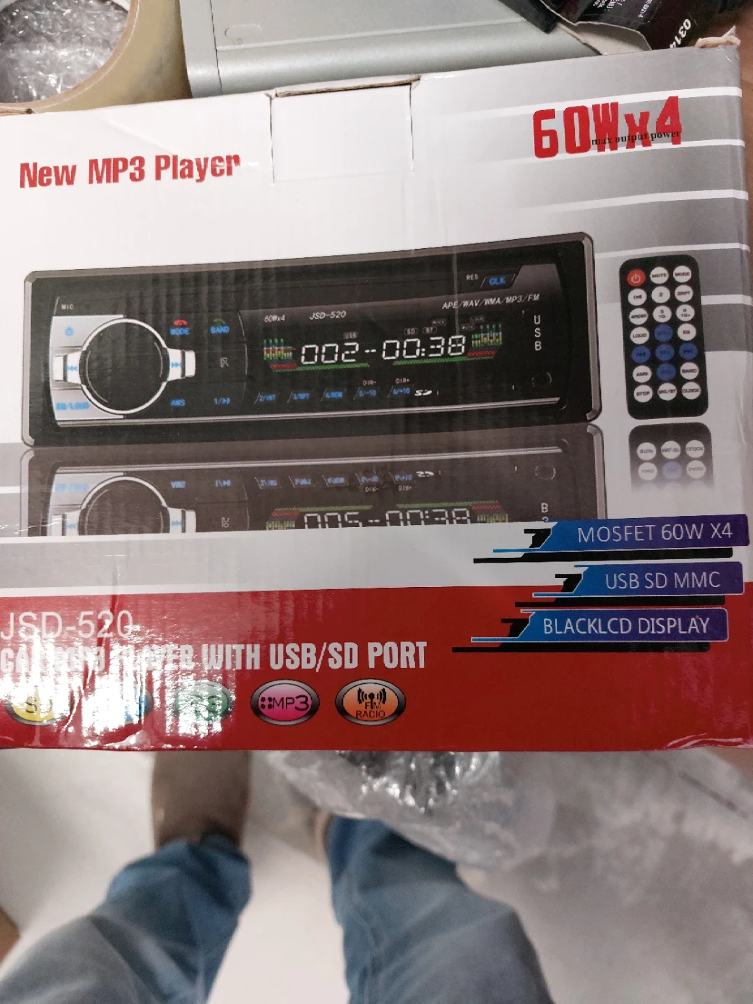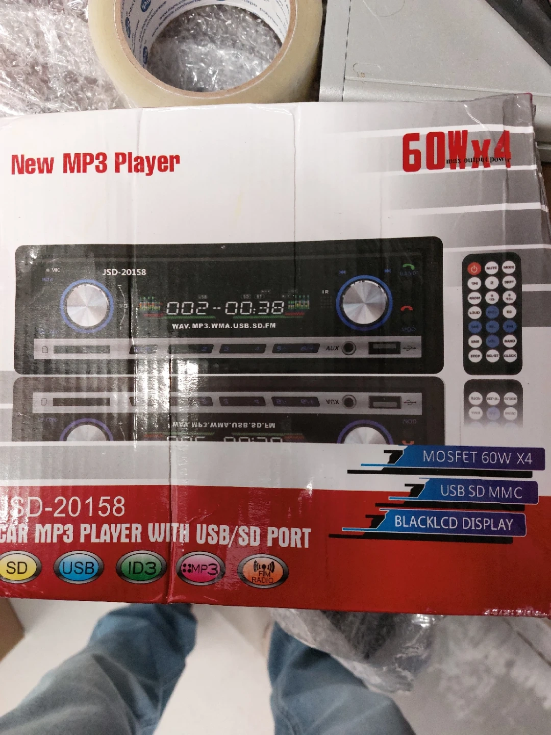 Selling a JSD-20158 car MP3 player. It comes with a USB/SD port. The box includes the remote control. It supports FM radio and has a digital clock display. It has a power output of 60 Watts x 4.
