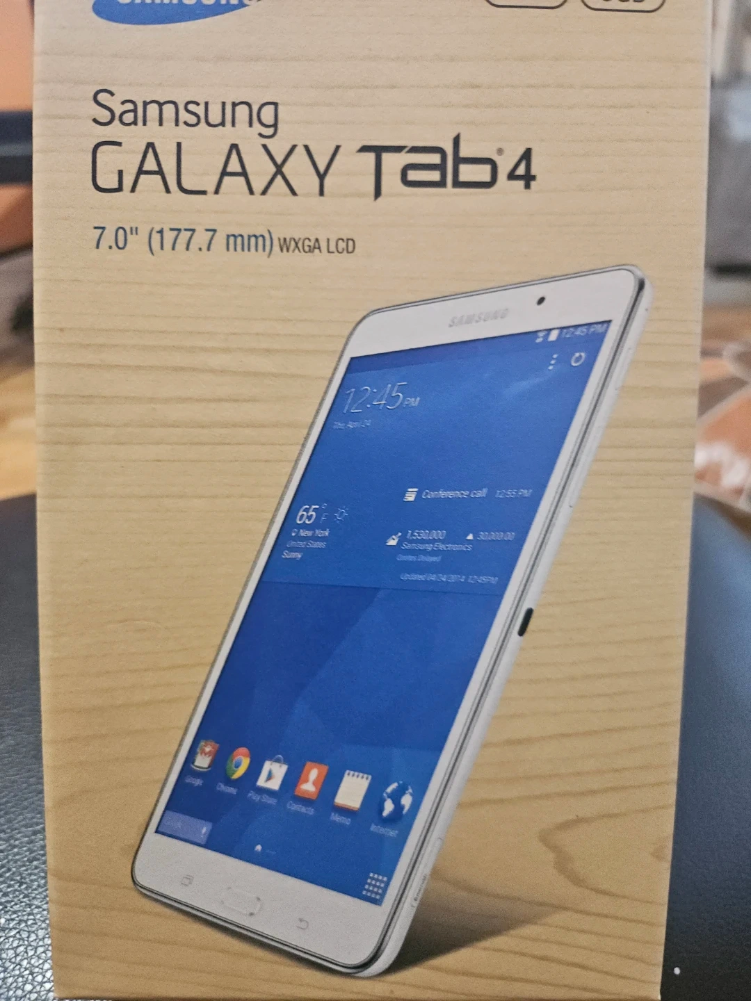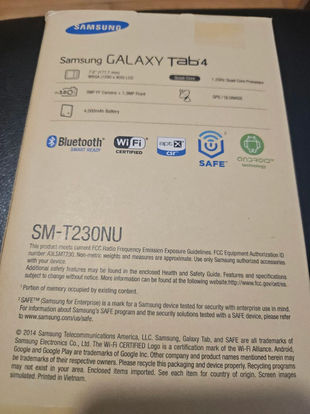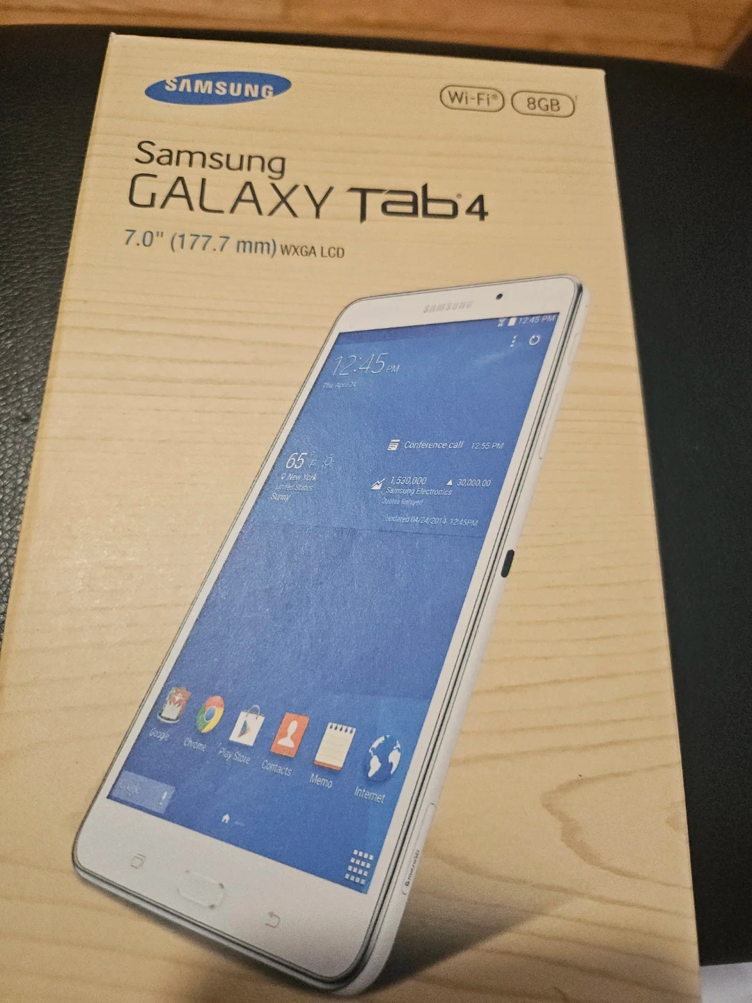 Selling a Samsung Galaxy Tab 4. It comes with a 7.0" (177.7 mm) WXGA LCD screen and 8GB of storage. The tablet also features a 3MP rear camera and a 1.3MP front camera. It's powered by a 4,000mAh battery. The box is included!