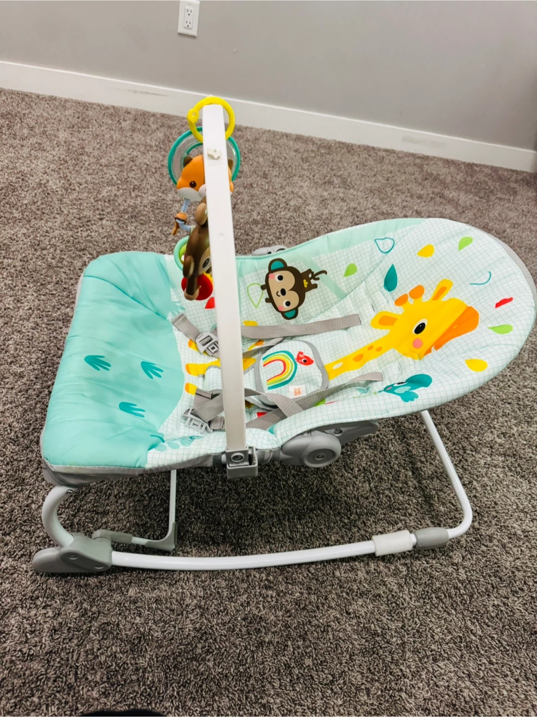 Selling a Bright Starts baby bouncer in great condition! It features a cute design with a giraffe and monkey. The bouncer has a toy bar with hanging toys to keep your little one entertained. Perfect for newborns up to a few months old
