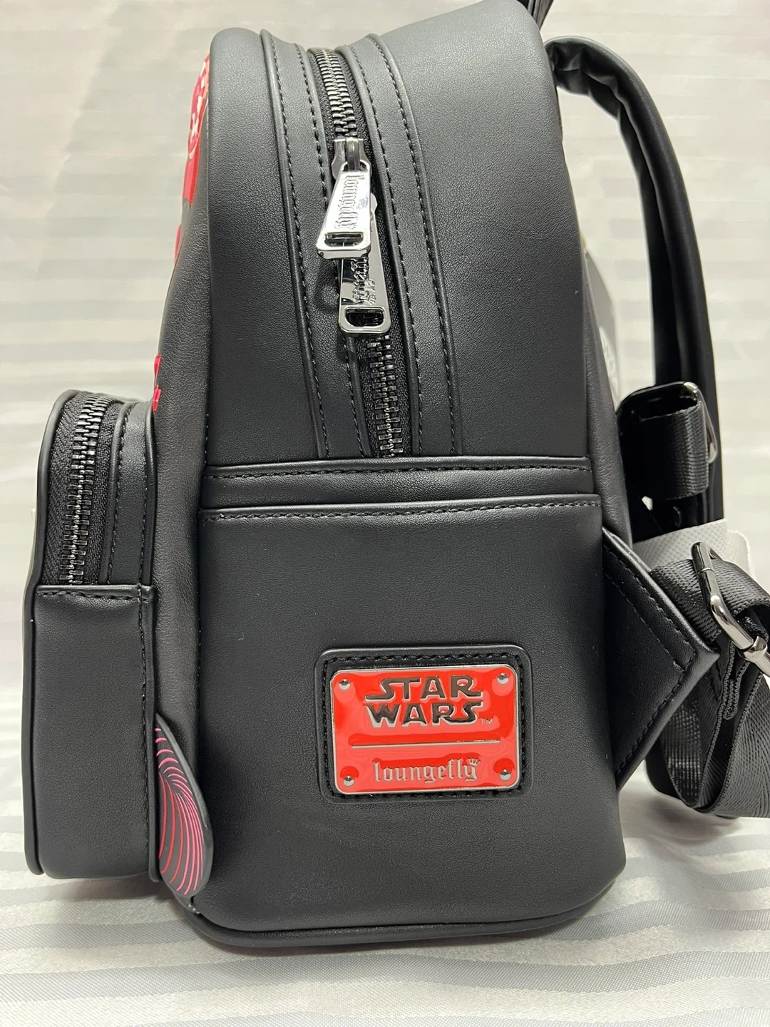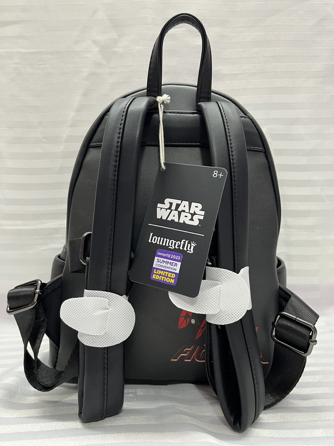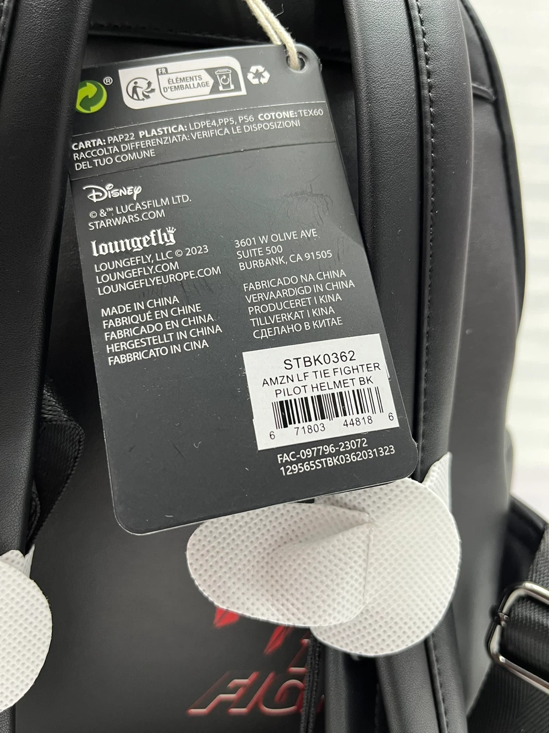 This Loungefly Star Wars backpack features a TIE Fighter Pilot Helmet design. It's a limited edition item from the Summer 2023 collection. The backpack has a black colour scheme with red accents. It also has a Star Wars Loungefly tag.