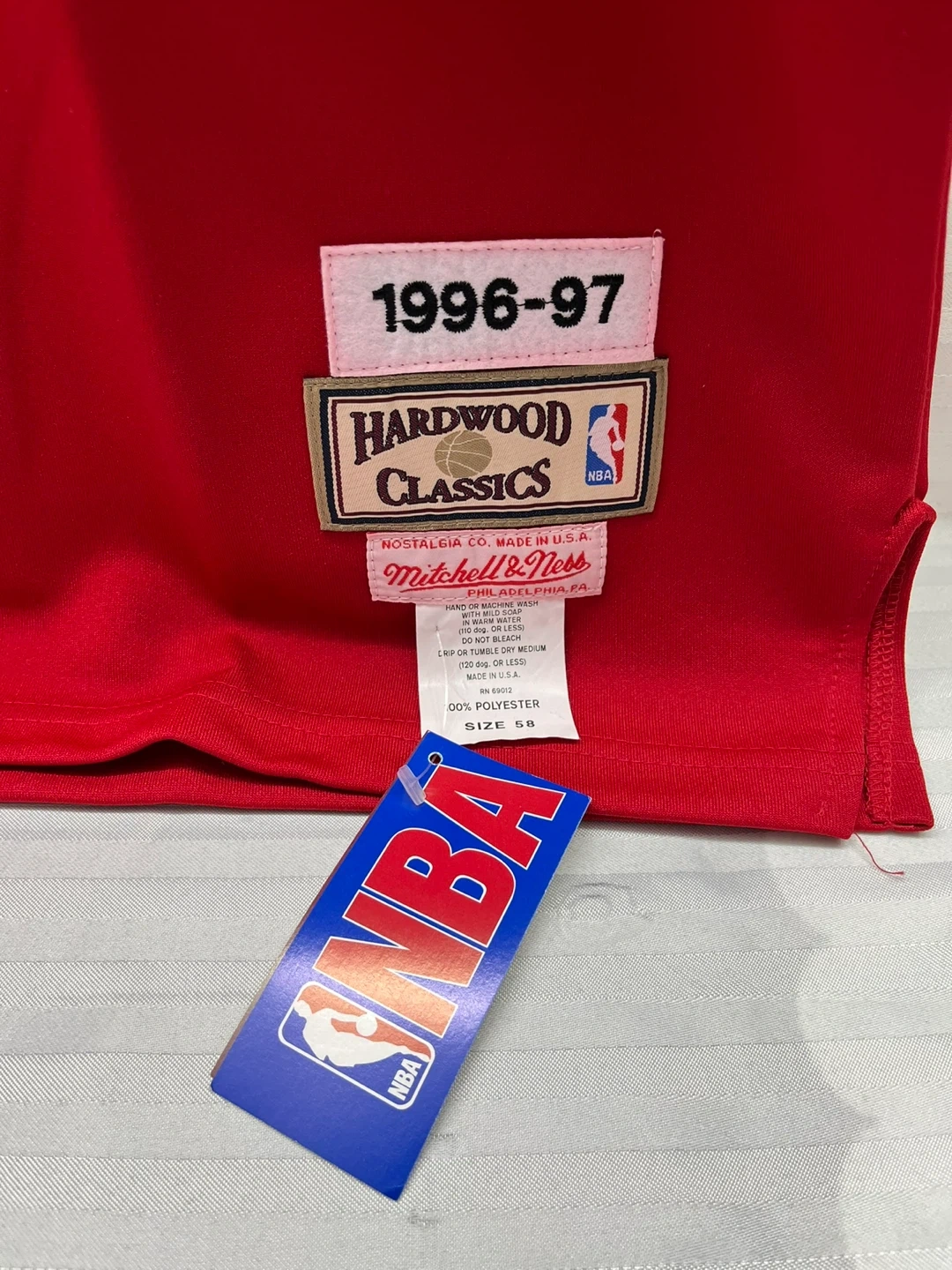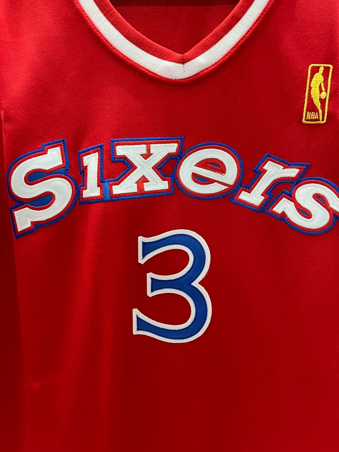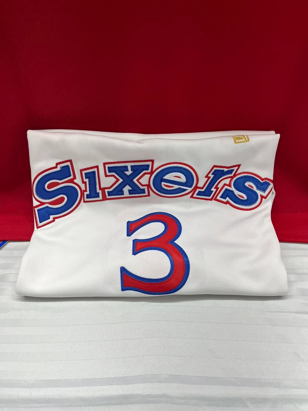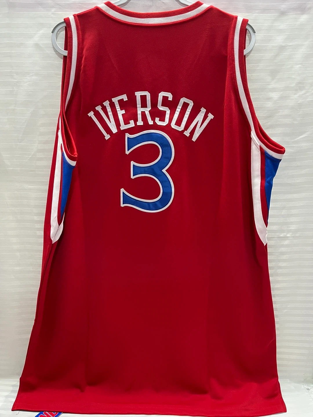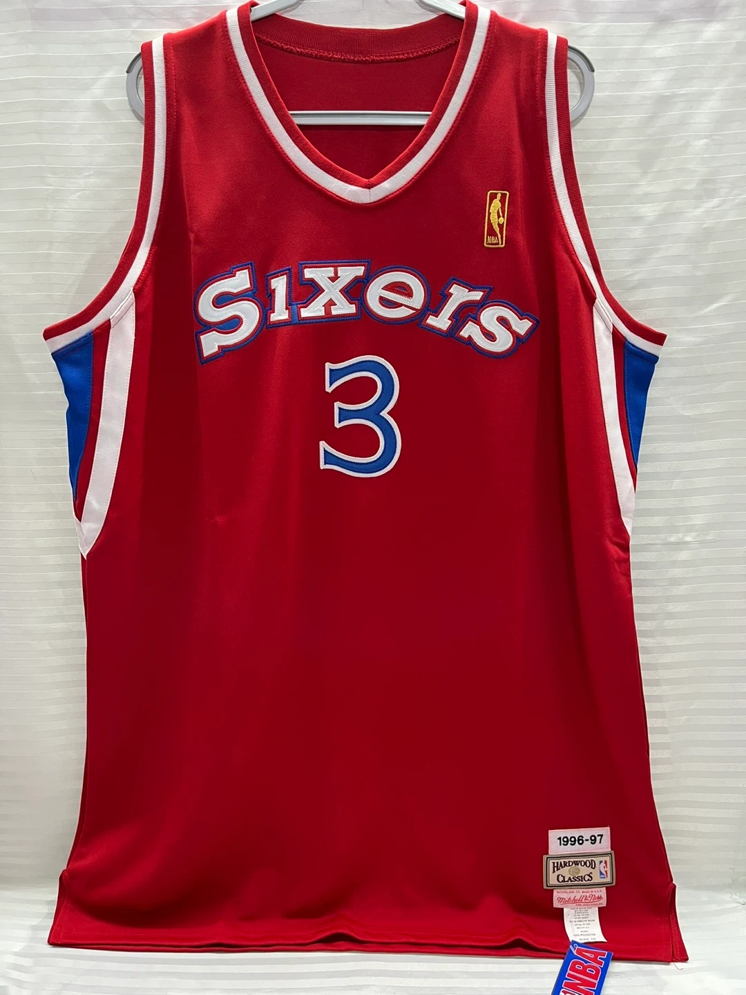 Selling a Mitchell & Ness Allen Iverson Philadelphia Sixers jersey. It's a Hardwood Classics jersey from the 1996-97 season. The size is 58 and it's made of 100% polyester. Great for any basketball fan!