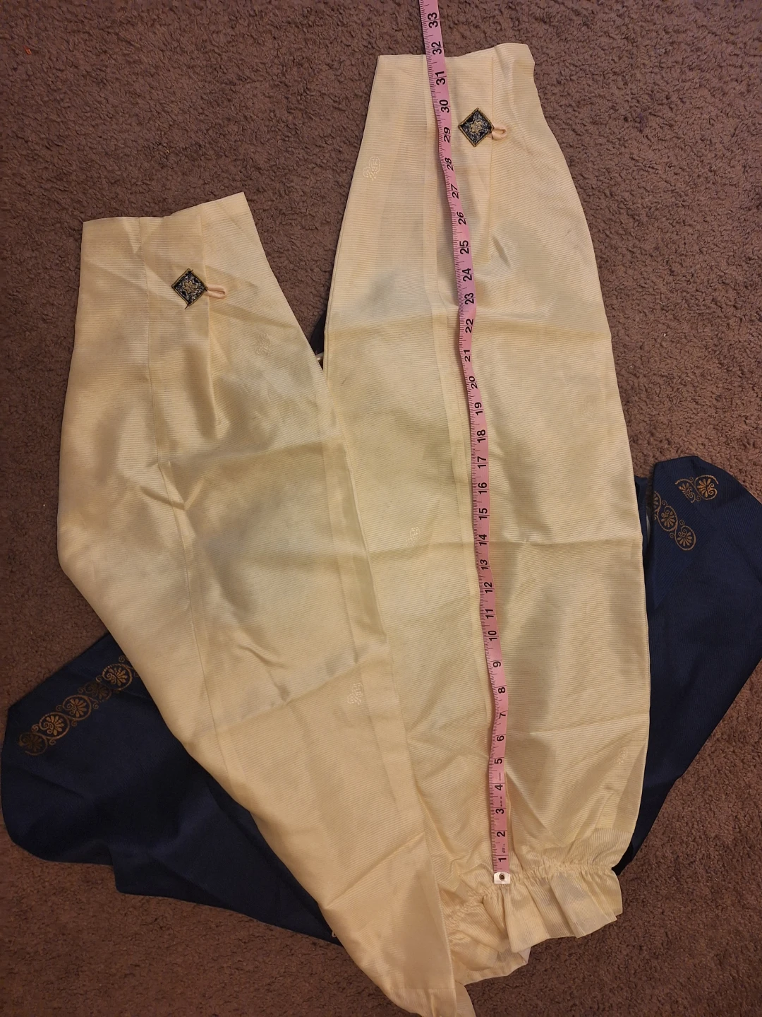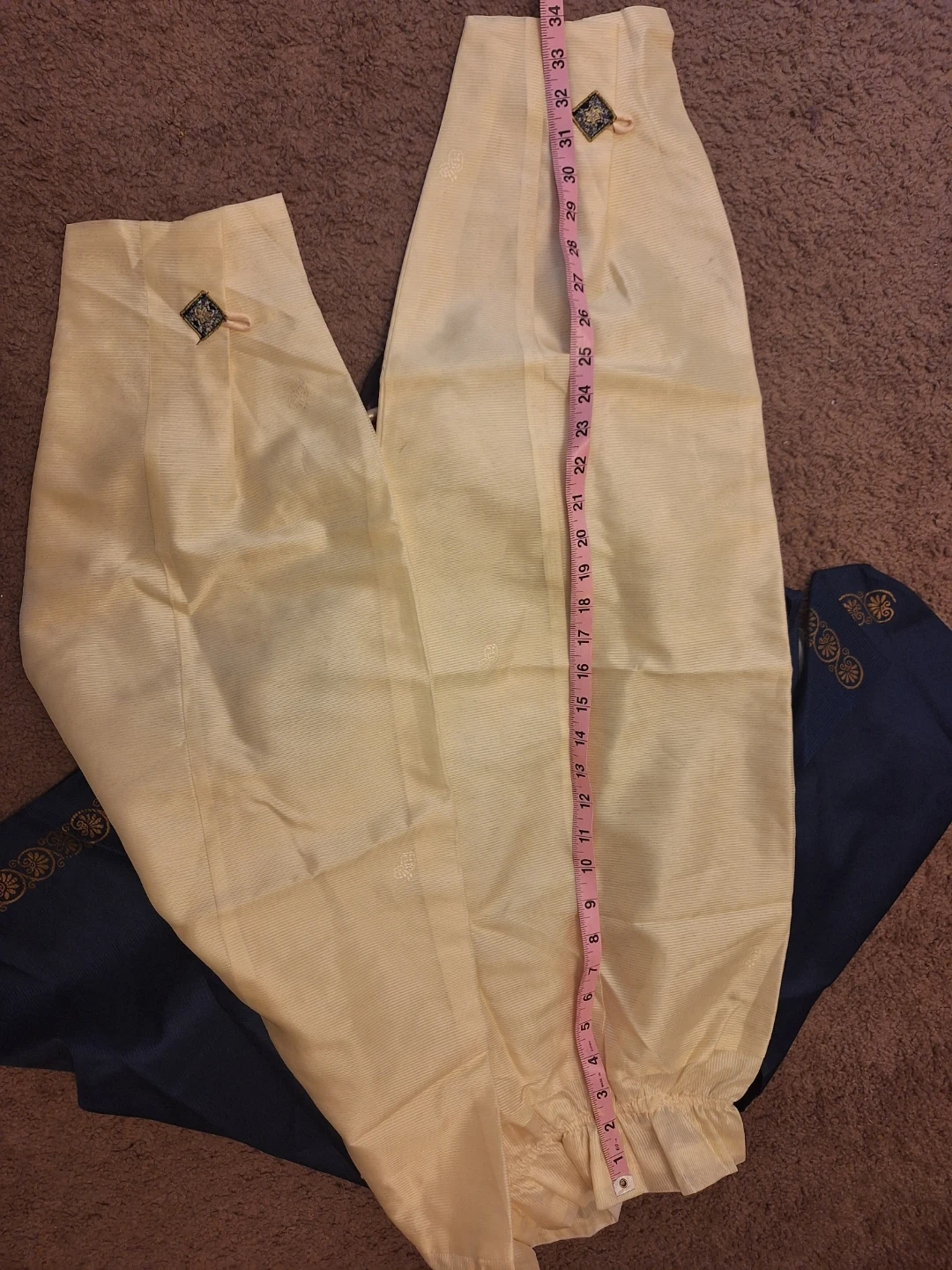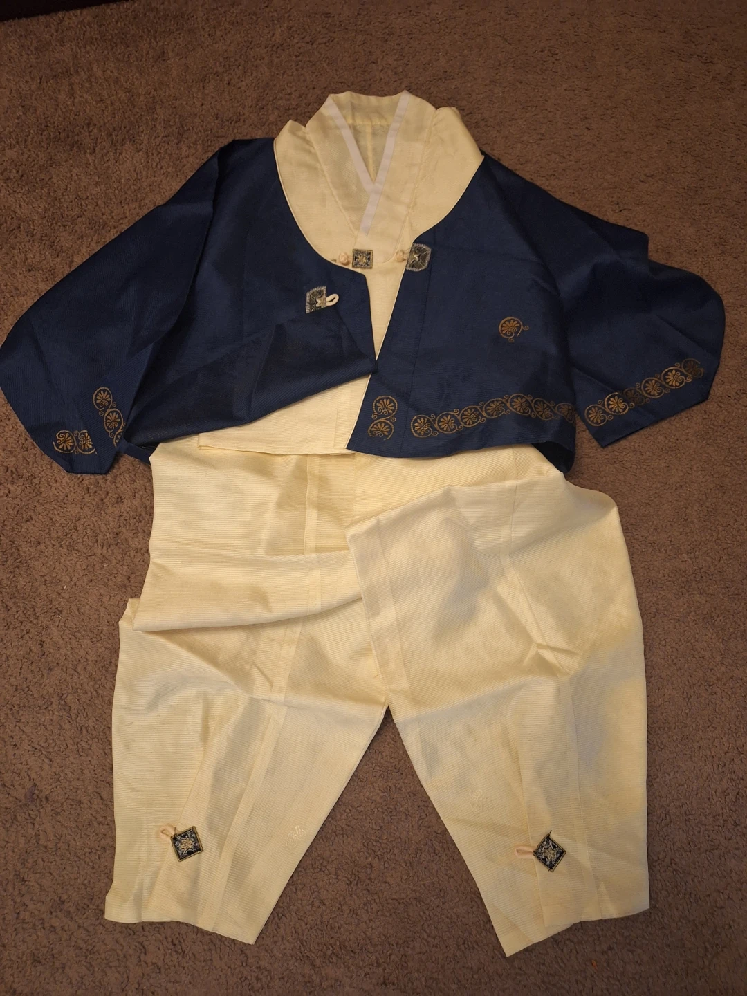 Traditional Korean Hanbok set in great condition! The set includes a navy blue jacket and cream-coloured pants. The pants appear to be approximately 33 inches long. Perfect for cultural events or special occasions. Pickup only