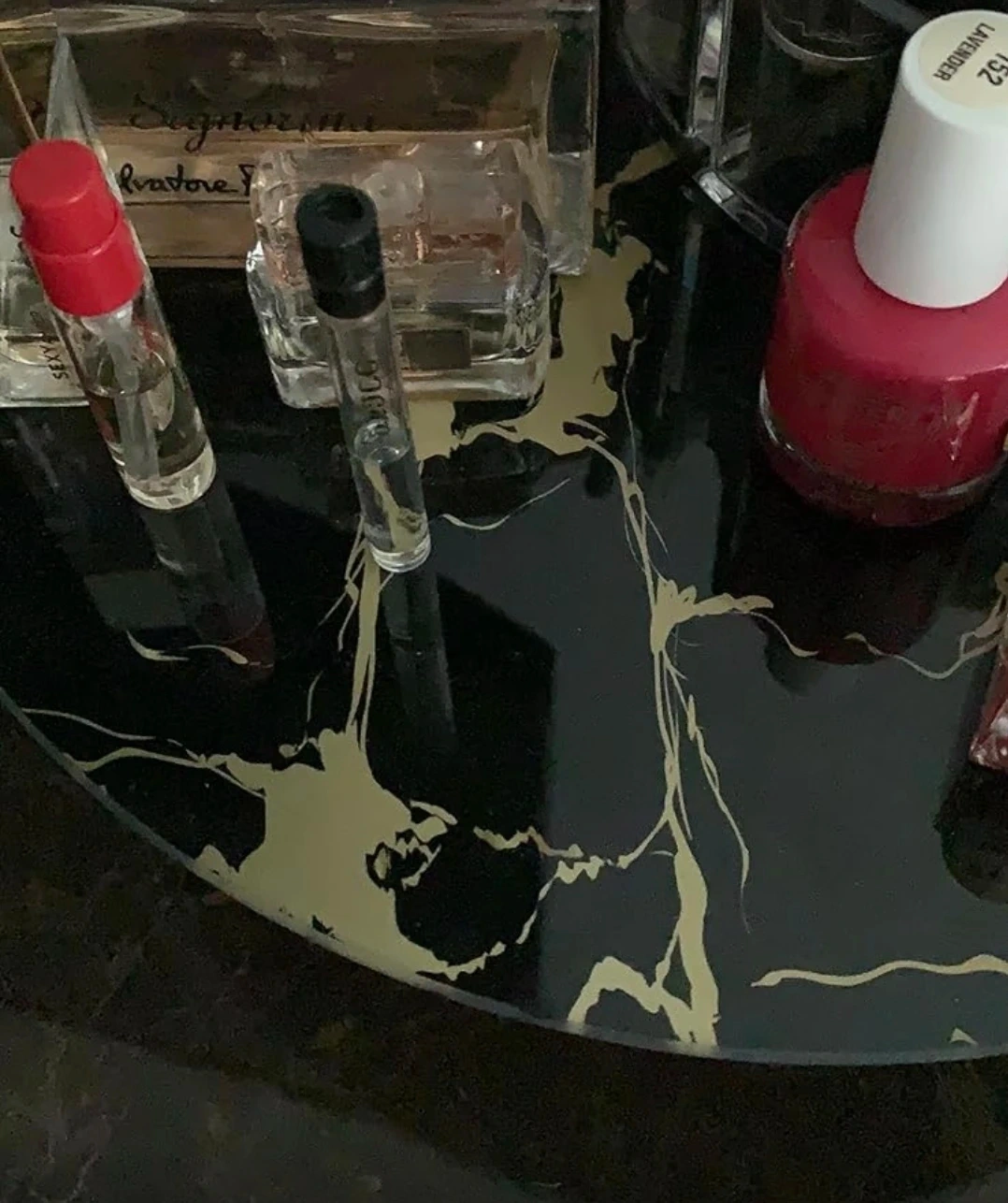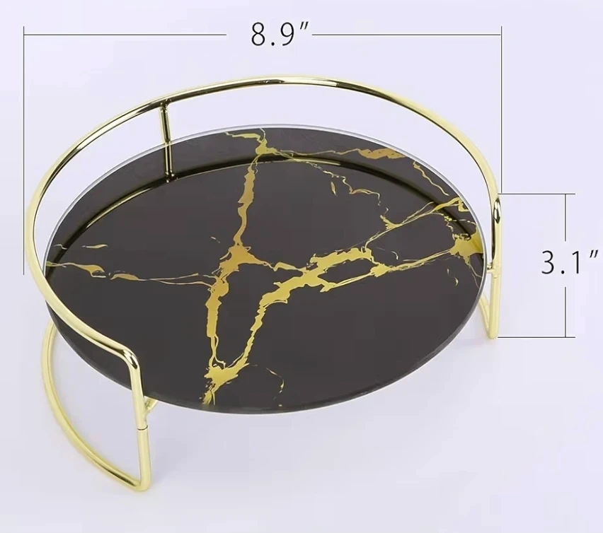 š„I'm selling a decorative tempered glass vanity tray that comes with a gold stand. The plate is black with a gold marbling pattern on one side and white on the other. It would be a great addition to any room!