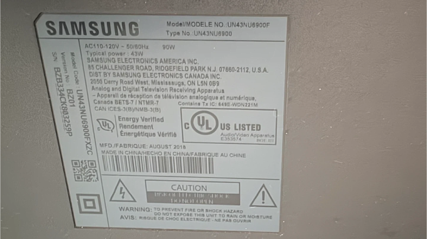 Selling a Samsung 43-inch Smart TV from the NU6900 series. It's in great condition and ready to plug in and enjoy! The model number is UN43NU6900F and it was manufactured in August 2018. Perfect for streaming your favourite shows or gaming!