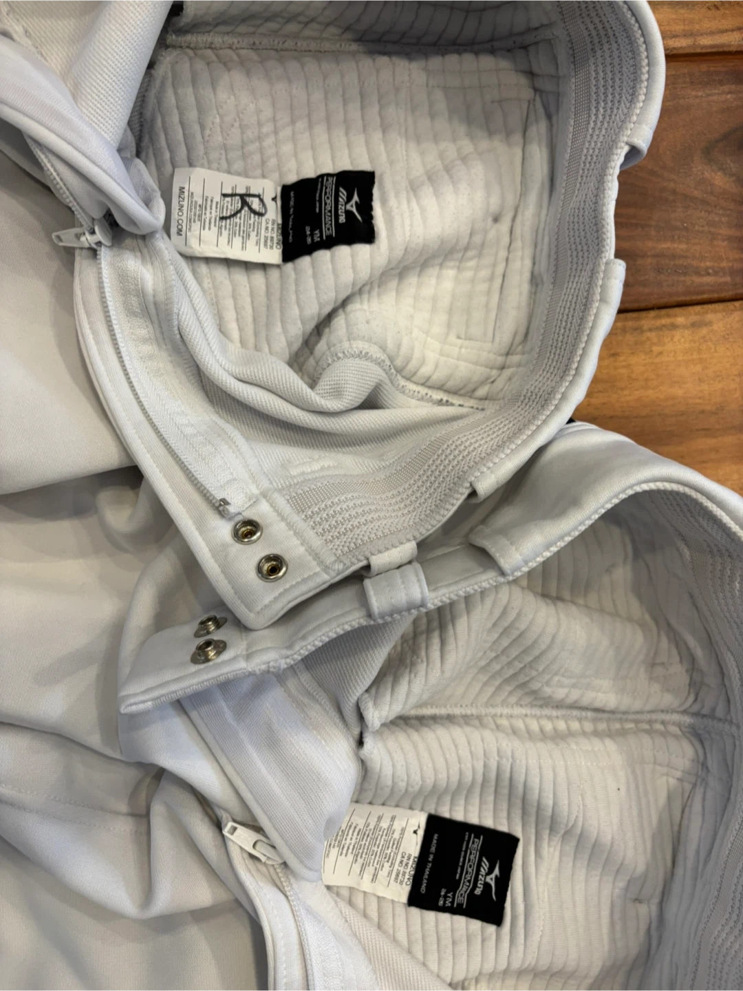 Selling a two pairs of Mizuno baseball pants in white with navy blue stripe. They have some signs of use, as pictured. Only used for 1 year of select baseball.
