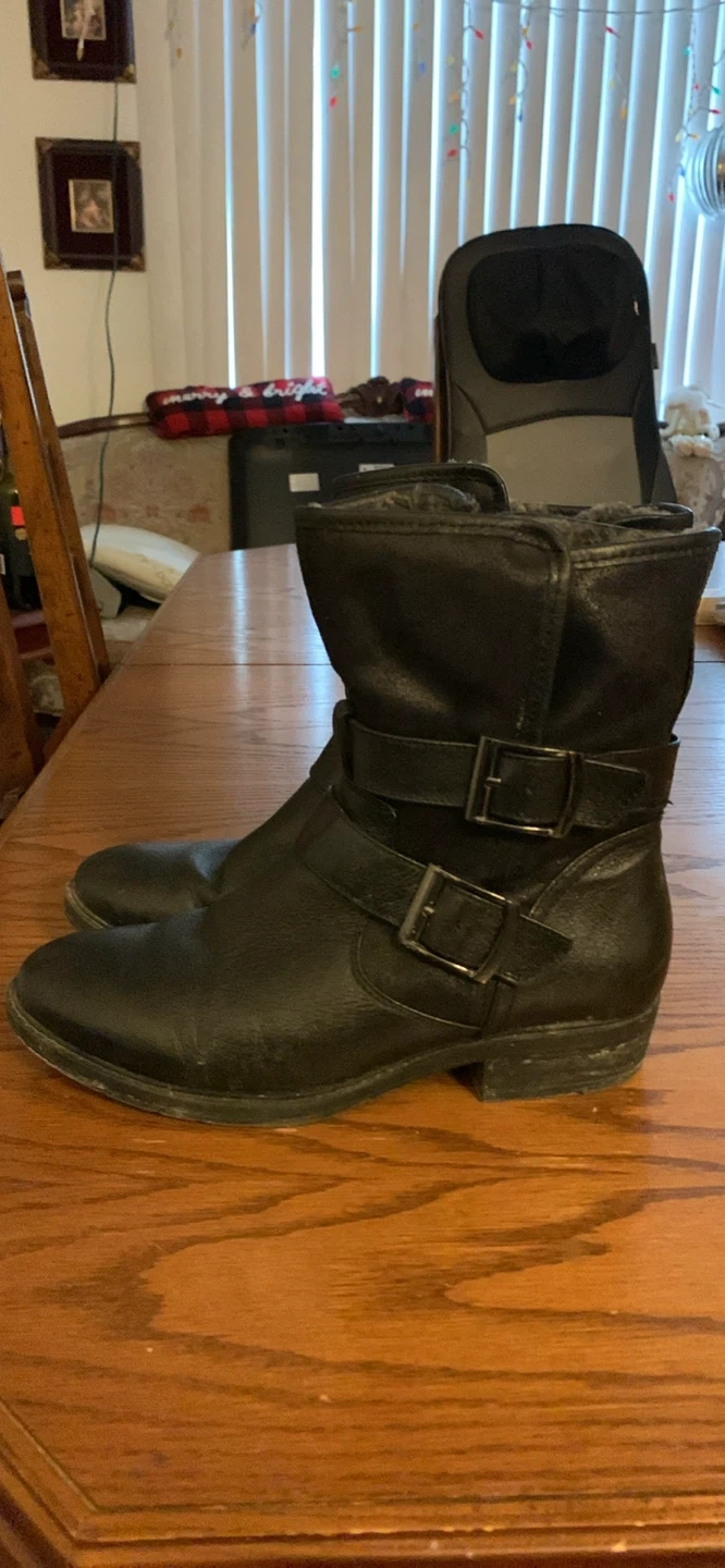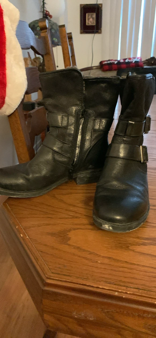 Here are a pair of Edelweiss boots in black leather. They have a zipper and buckle design. They show some signs of wear.