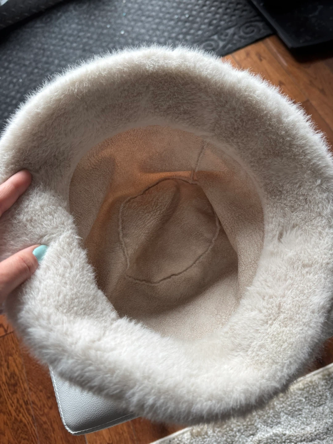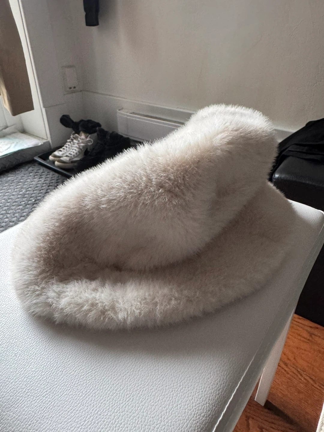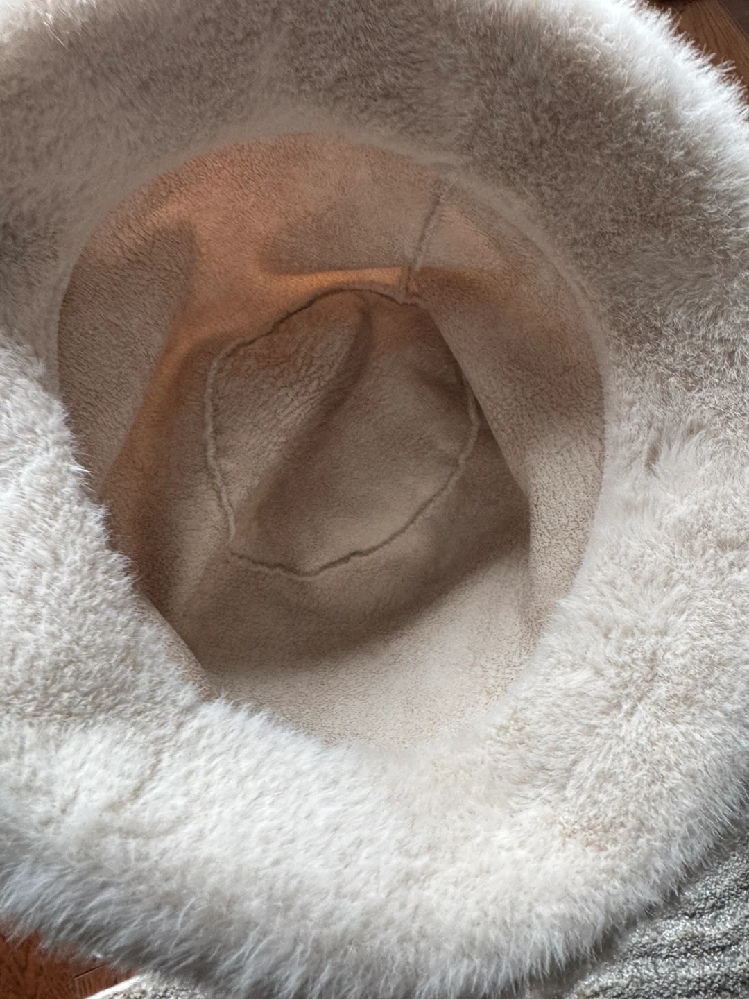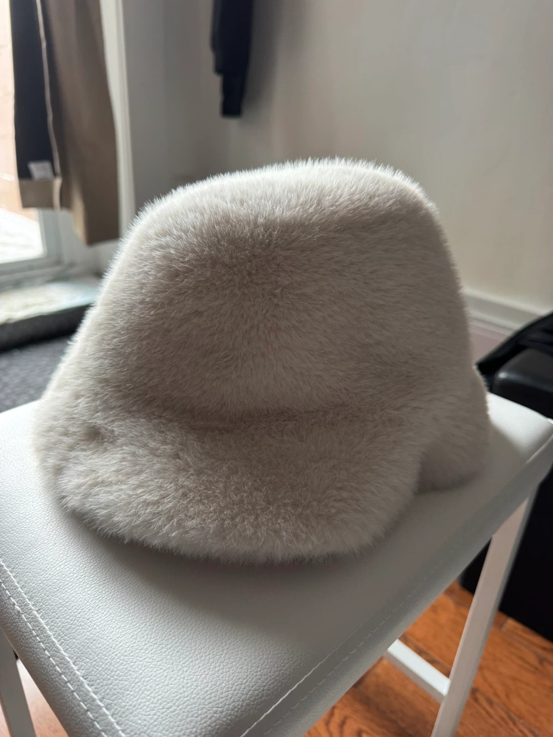 Selling a cream-coloured fuzzy bucket hat. It's super soft and in great condition! Perfect for keeping warm and stylish during the colder months