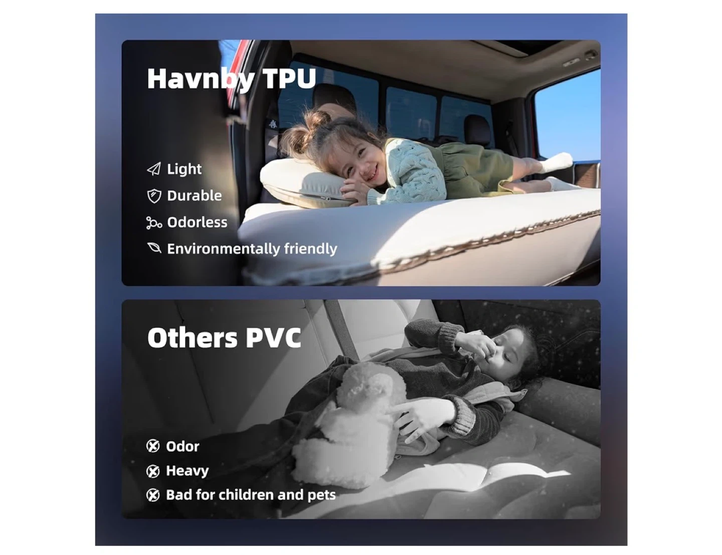 This Havnby TPU air foam camping bed is perfect for your next outdoor adventure! It's designed for use in the back seat of pickup trucks, making it a This is a Havnby TPU Air Foam Camping Bed, perfect for truck camping. It fits in the back seat of pickup trucks, and is a portable travel sleeping mattress.