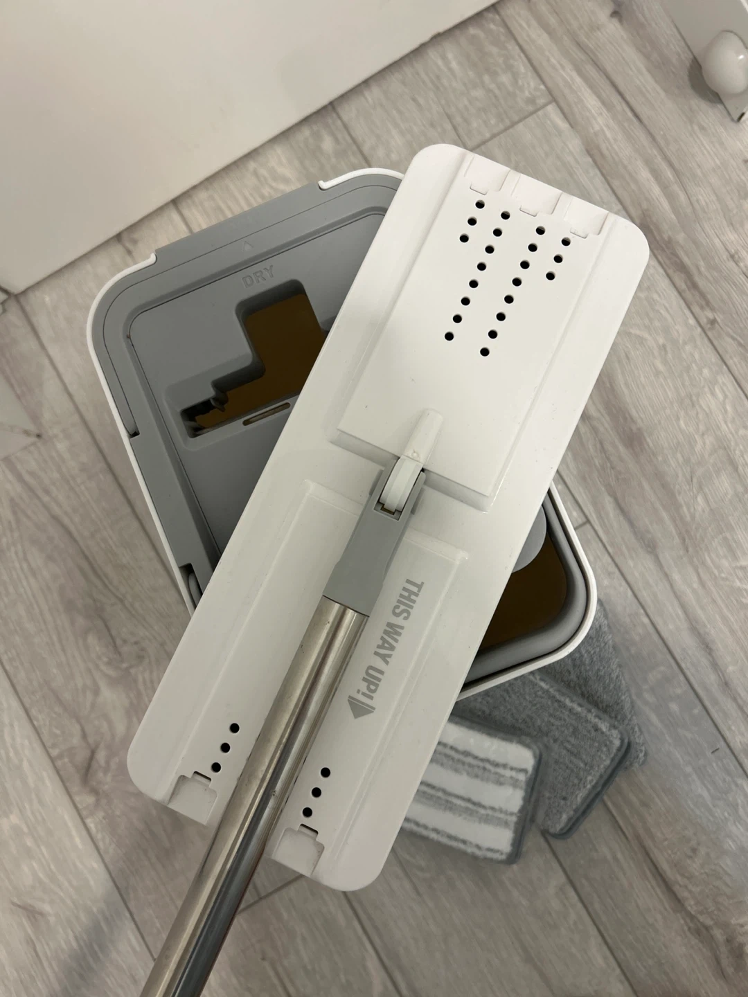 I'm selling a Joymoop mop and bucket set! It's in great condition and ready to help keep your floors sparkling clean. The set includes the bucket with separate wash and dry compartments, the mop handle, the mop head, and several mop pads.