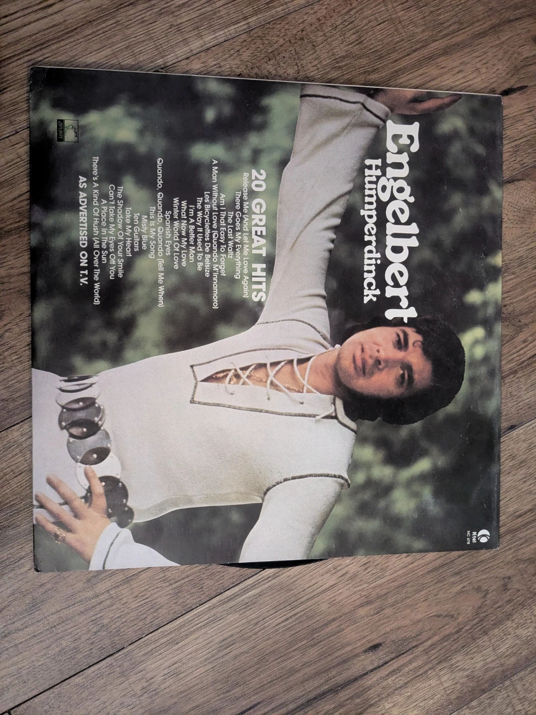 Selling an Engelbert Humperdinck vinyl record titled "20 Great Hits"! It's an album advertised on TV and includes songs like Release Me, The Last Waltz, and Spanish Eyes. Perfect for any vinyl collector or Engelbert Humperdinck fan