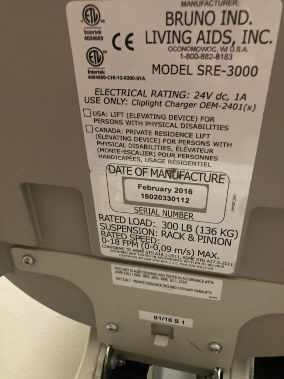 Selling a straight Bruno SRE-3000 stair lift. The manufacture date is February 2016. It has a rated load of 300 lb (136 kg)