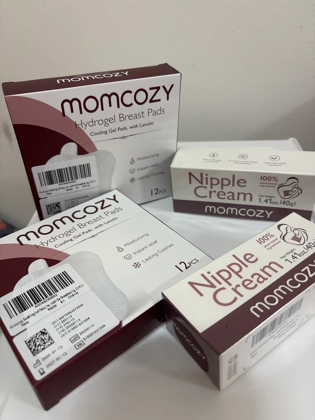 I'm selling a set of Momcozy products for breastfeeding moms. This includes hydrogel breast pads with lanolin and nipple cream.