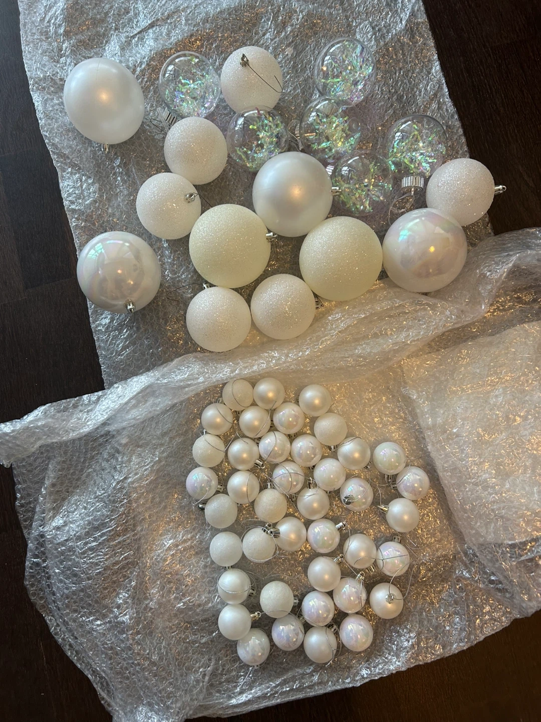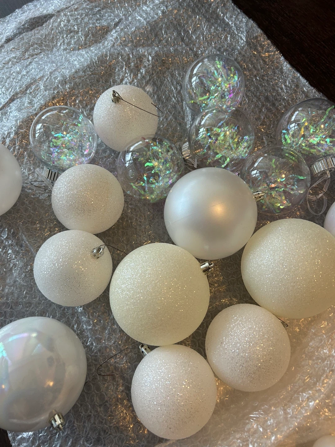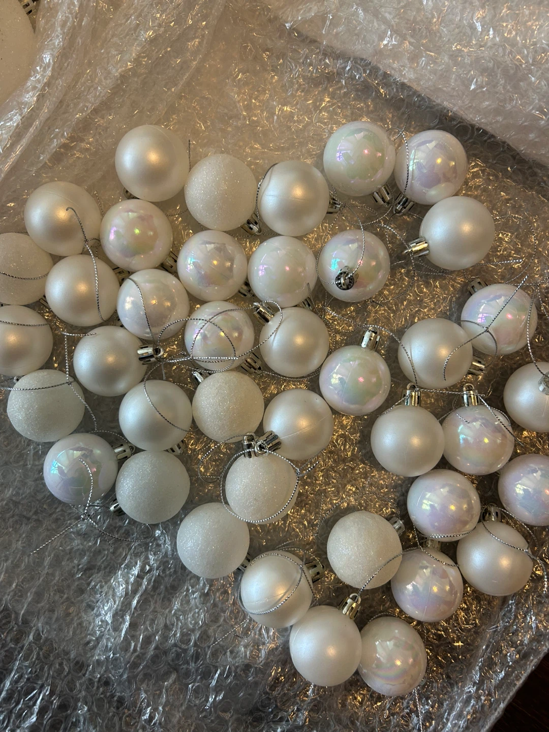 Selling a collection of white Christmas ornaments in various sizes and finishes. There are pearl, glitter, and clear iridescent styles to add some sparkle to your tree!