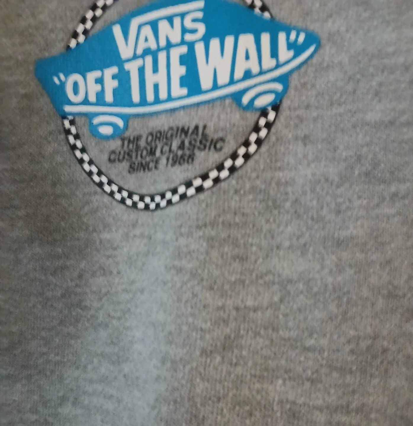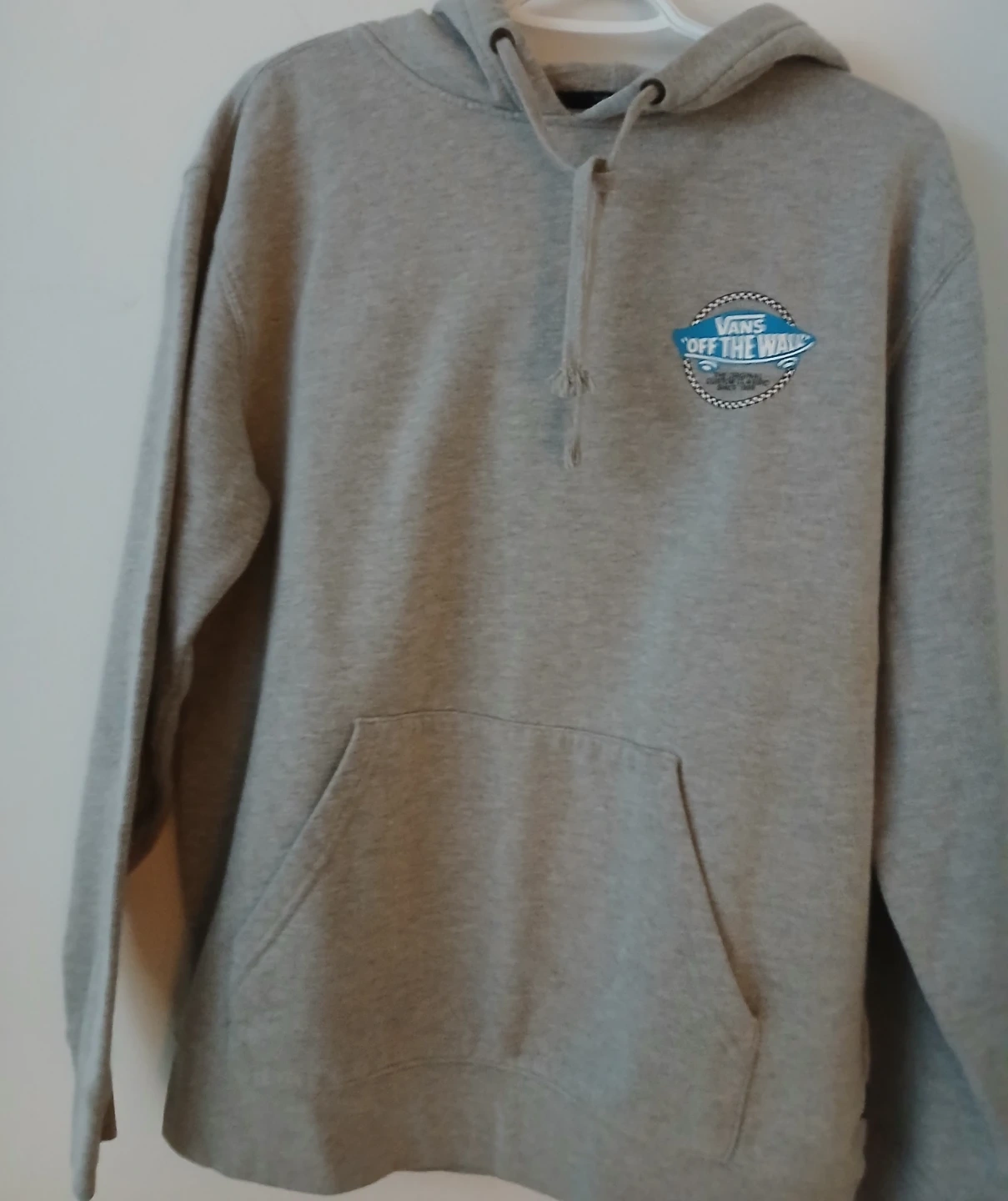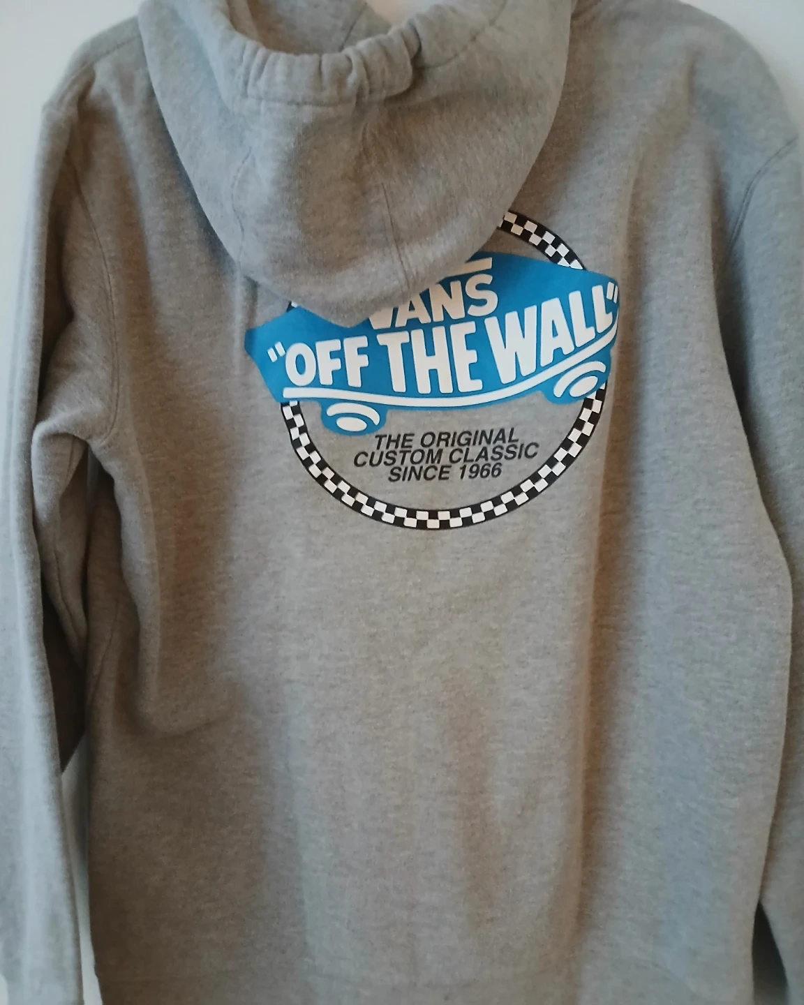 Here's a Vans hoodie in grey! It features the classic 'Off The Wall' logo on the front and back. A cozy and stylish addition to any wardrobe!