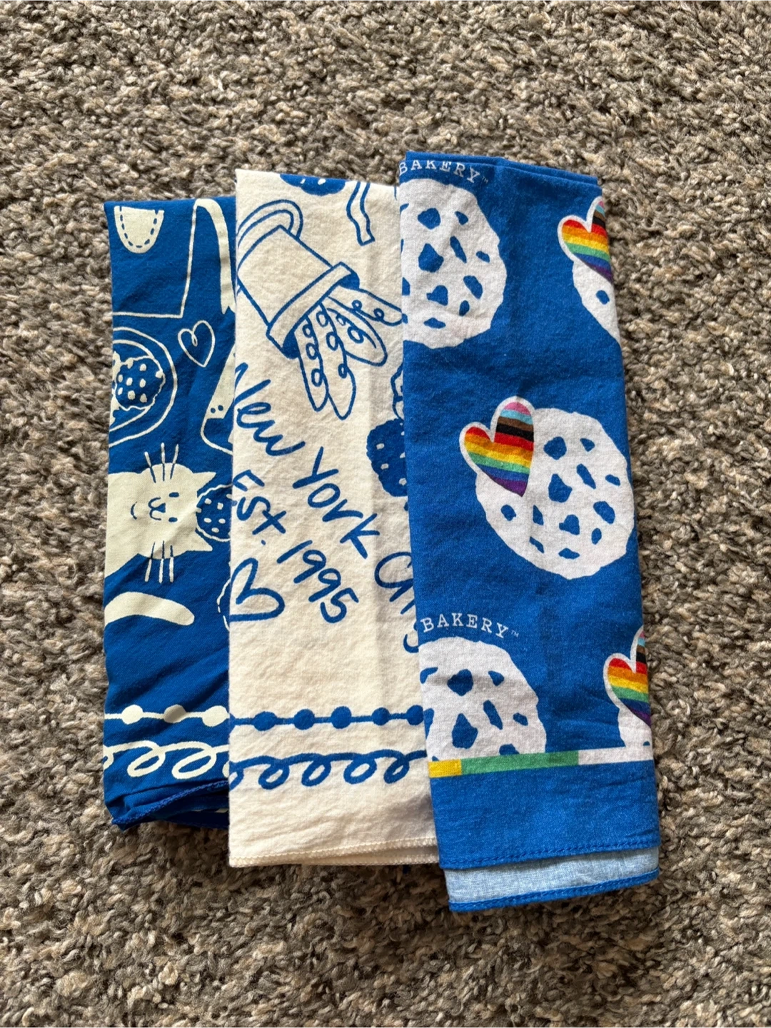 Three Levain Bakery bandanas: 1. 30th Anniversary branding, blue ink screen printed on cream, 2. 30th Anniversary branding, white ink screen printed on blue, 3. Pride edition, multicolored woven design.