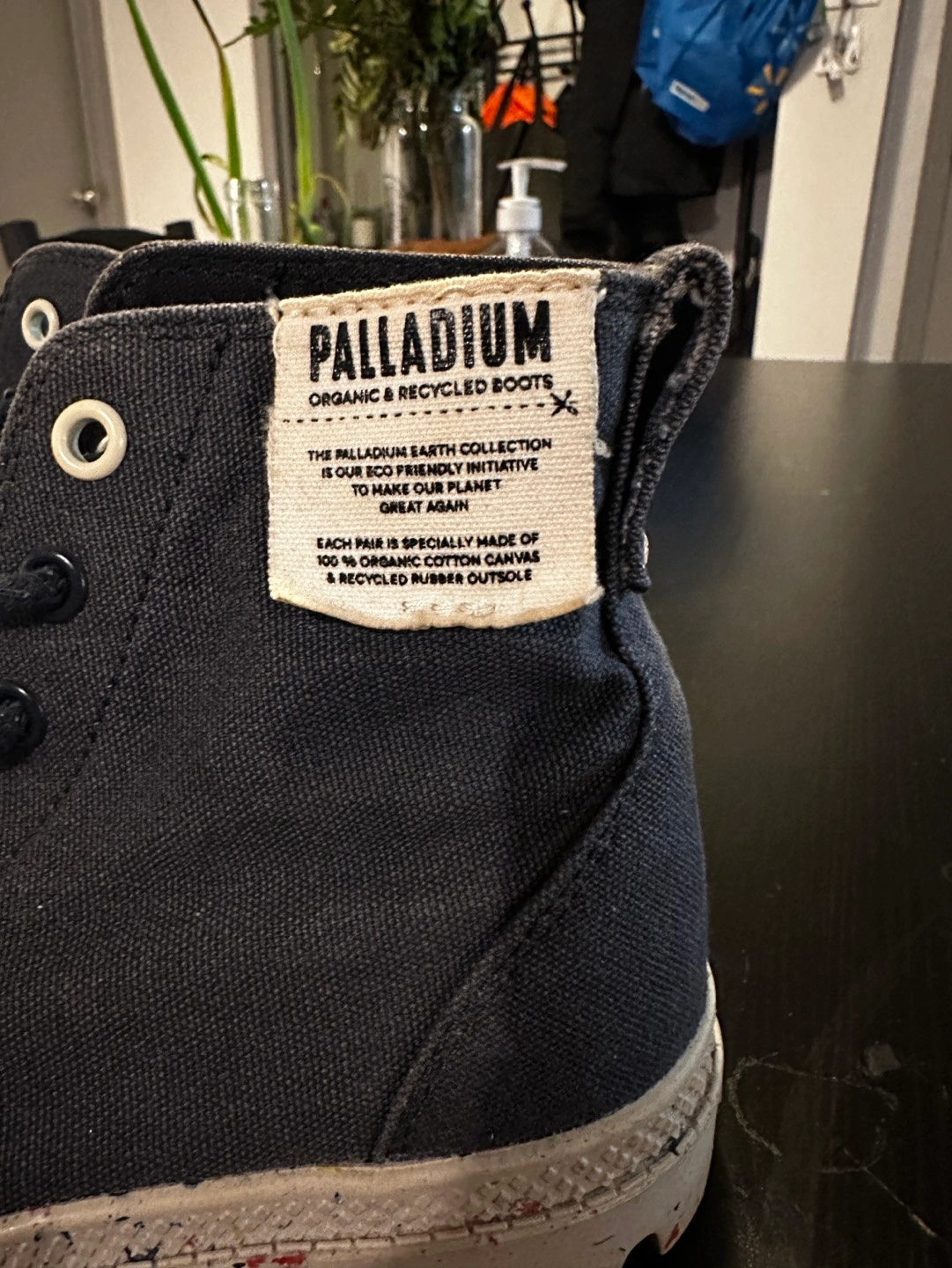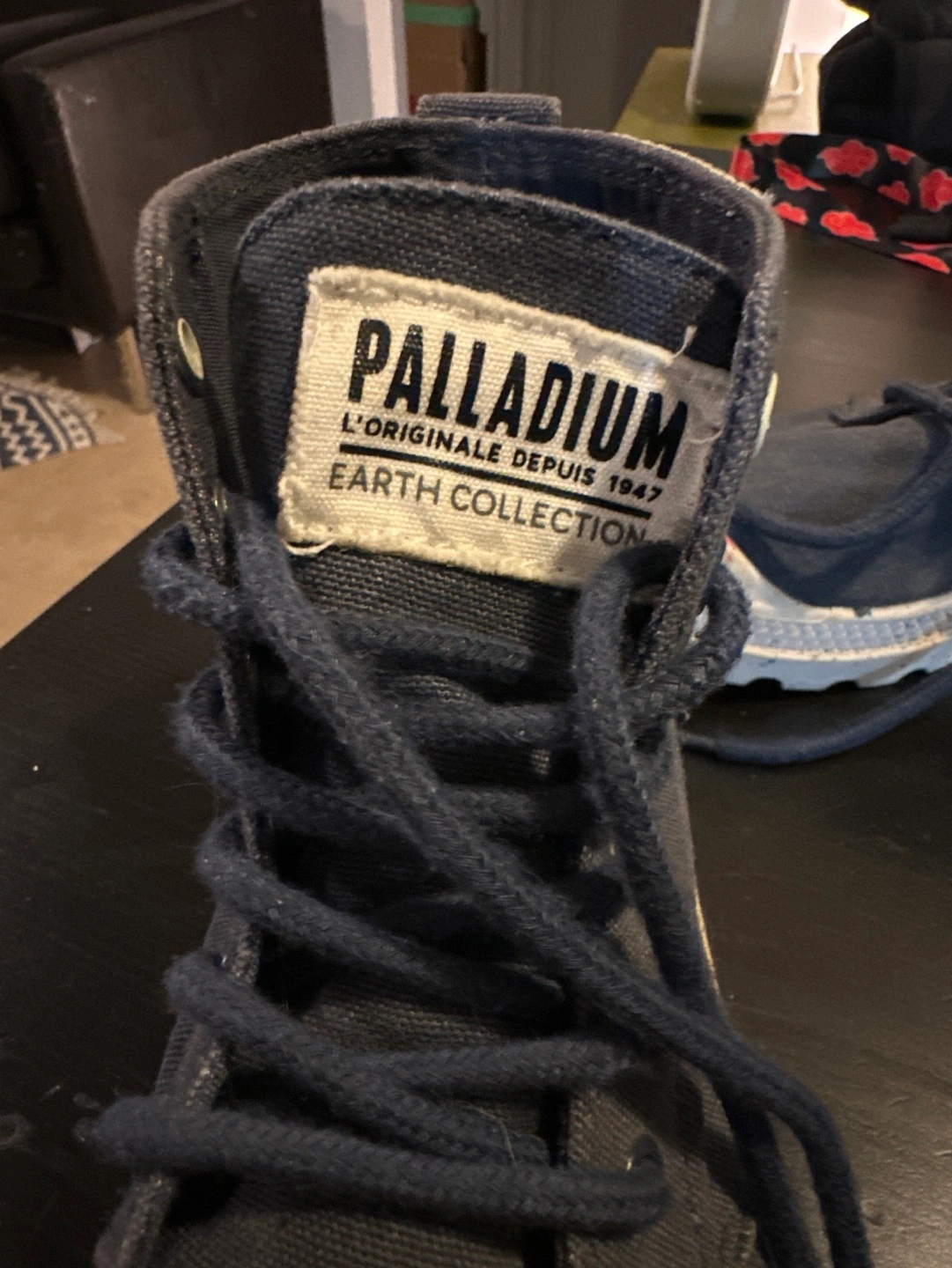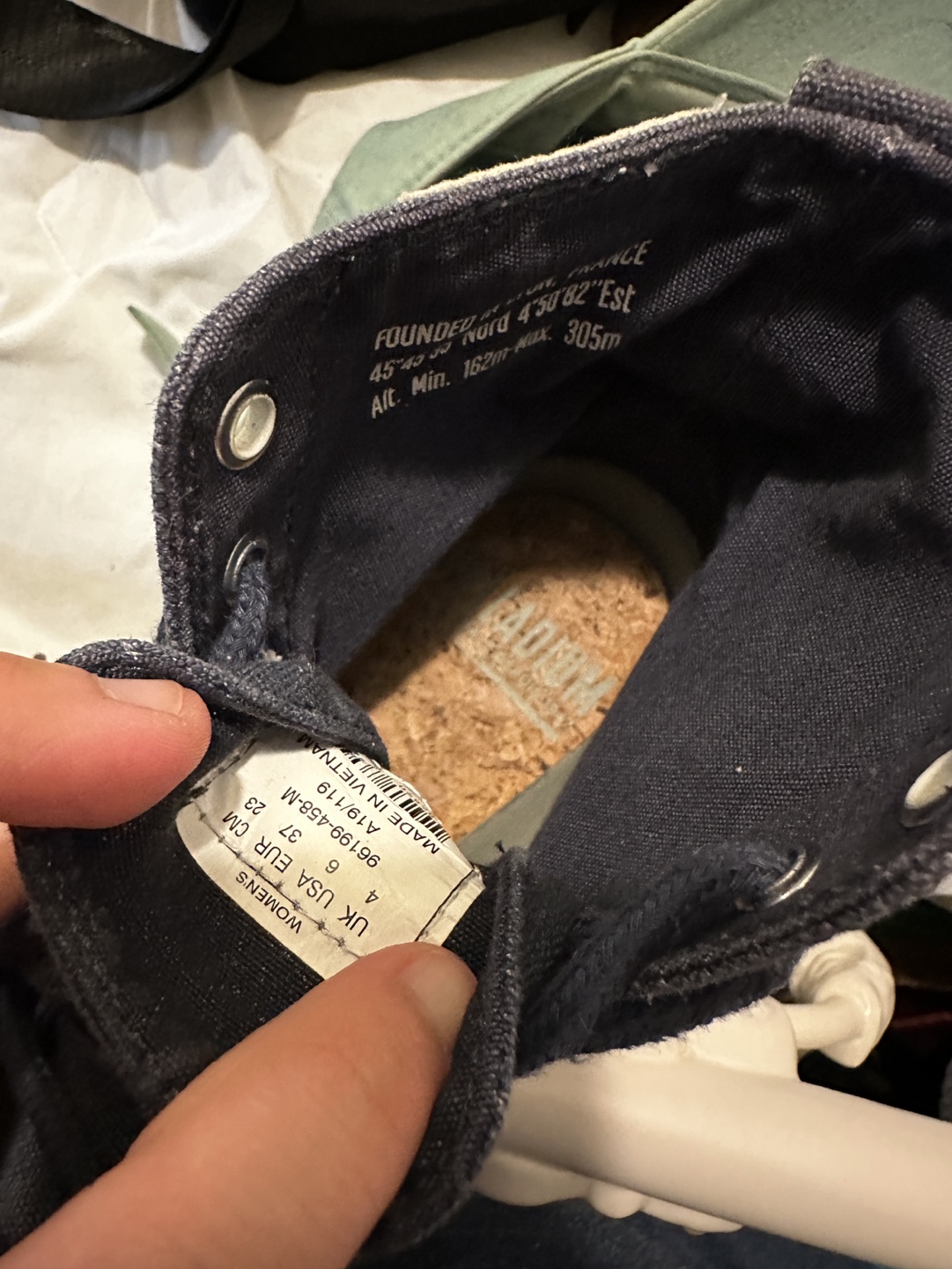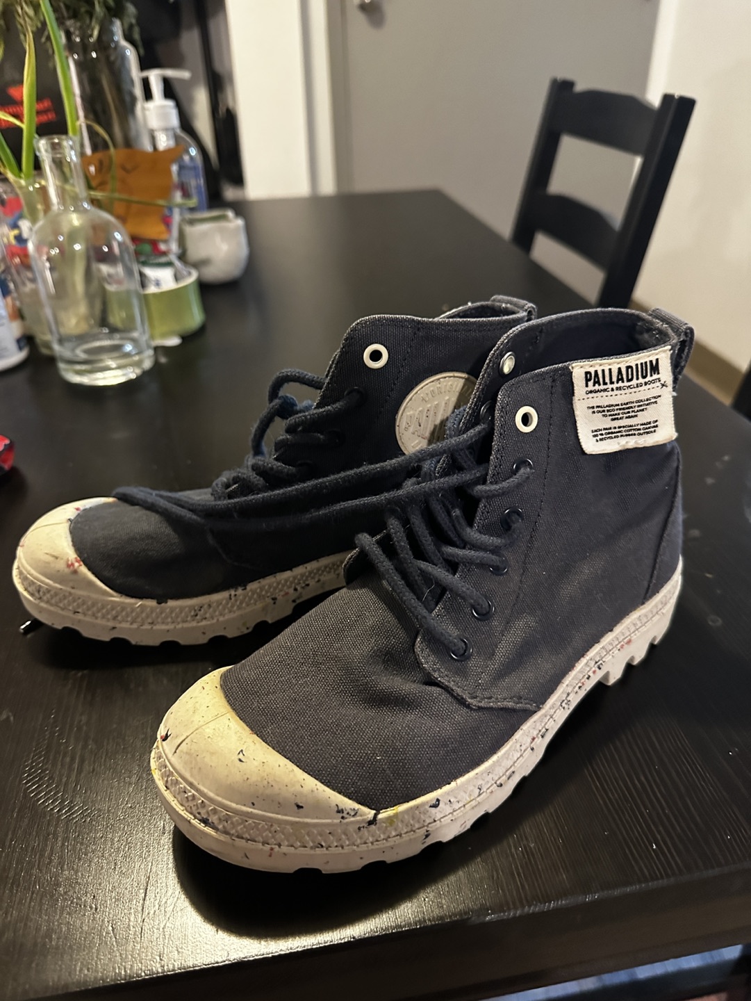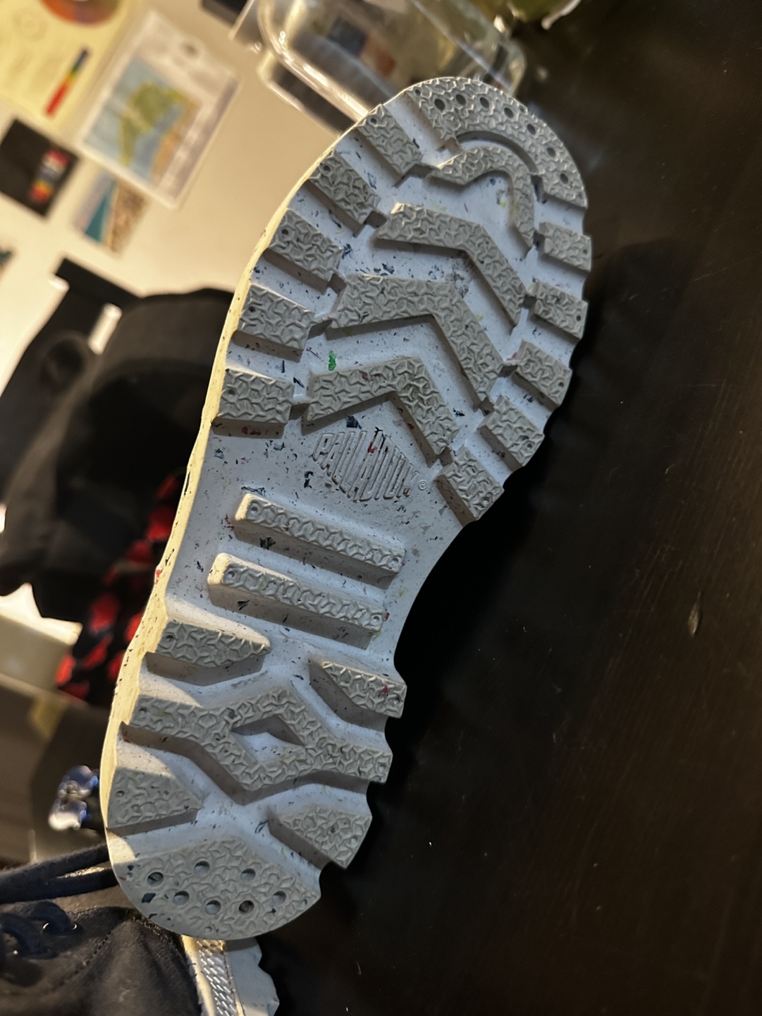 Only worn 3 times and were kept in shoe shelf. Very clean and the bottom is almost completely clean. Shoe sole is made of cork and the outsole is recycled rubber. The outer sole is designed with a paint splatter effect.