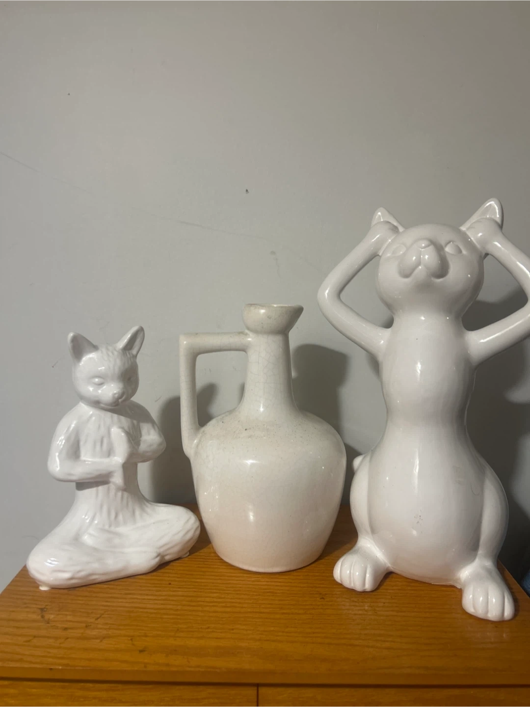 Selling a set of decorative items, including two white ceramic cat figurines and a matching vase. These pieces would look great on a shelf or side table, adding a touch of charm to any room. They are in good condition and ready to find a new home!