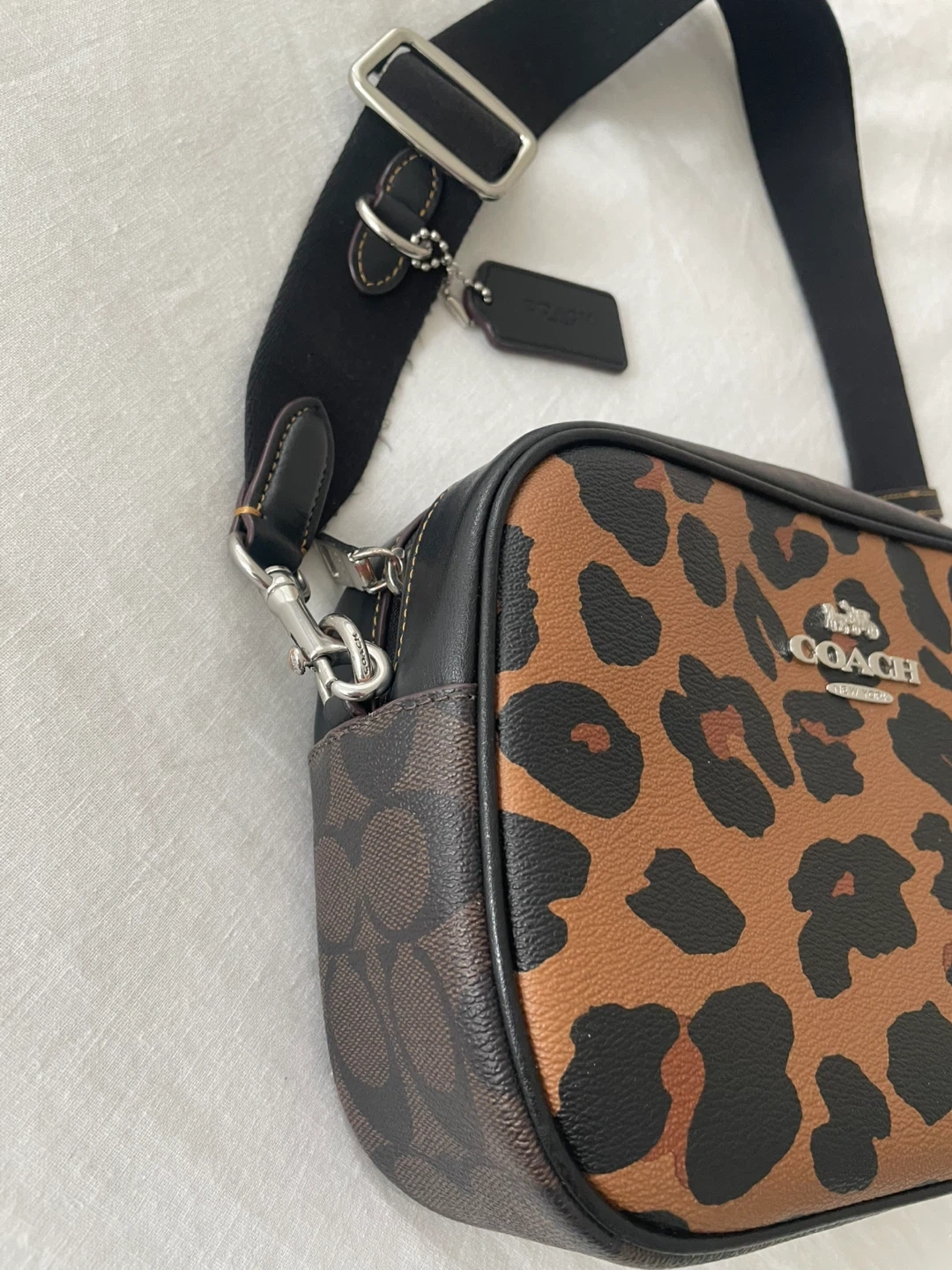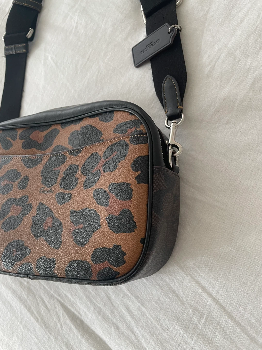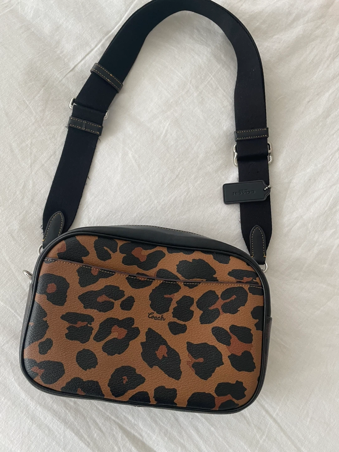 Selling a Coach camera bag in a stylish leopard print! It's in great condition and features a black strap. Perfect for carrying your essentials in style
