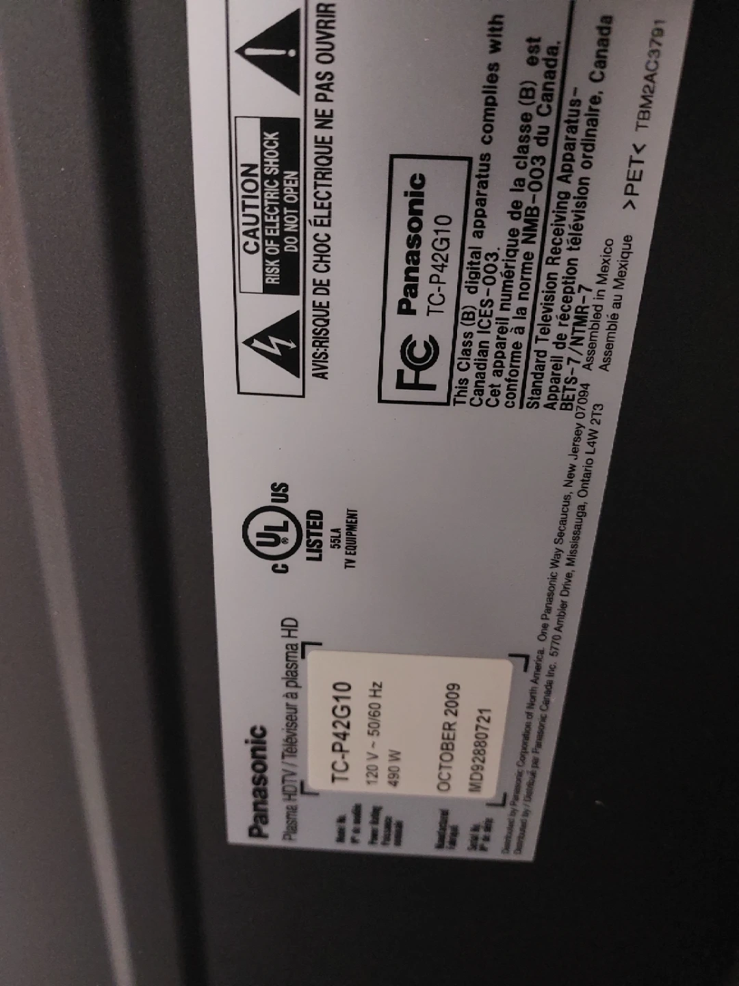 Selling a Panasonic TC-P42G10 Plasma HD TV. It's in good working condition and ready for a new home entertainment setup! This model was manufactured in October 2009. It features various ports, including HDMI and SD card slots for connectivity. Only for wall including mounting hardware work great with remote control just need to sell because I need room in my storage