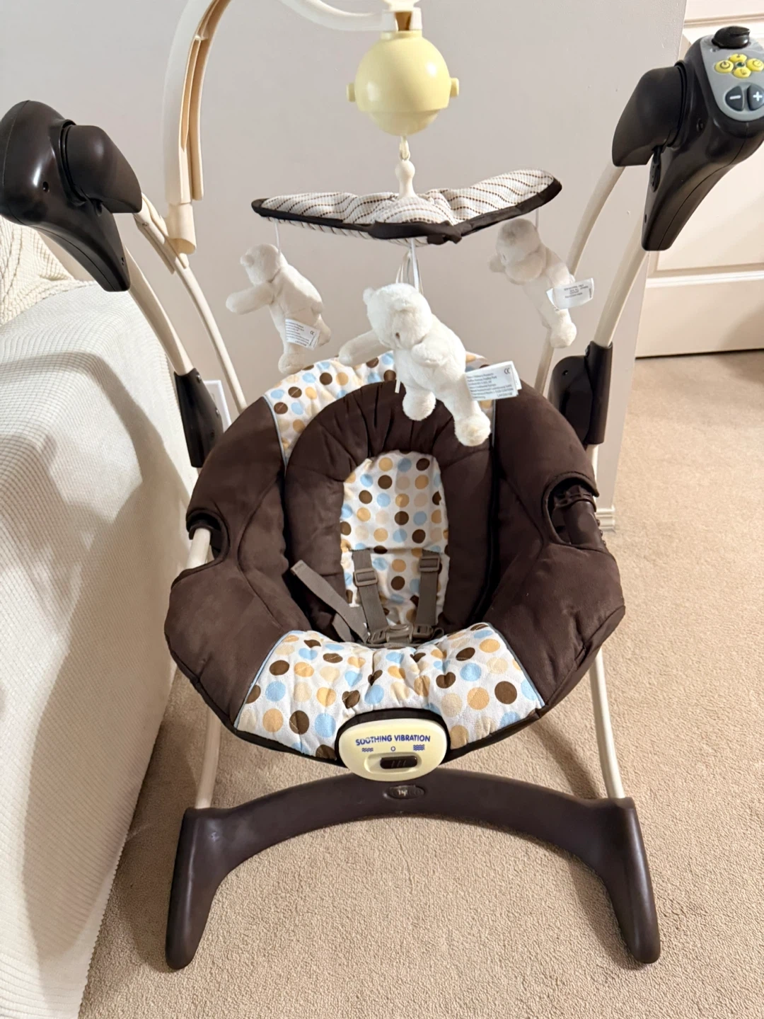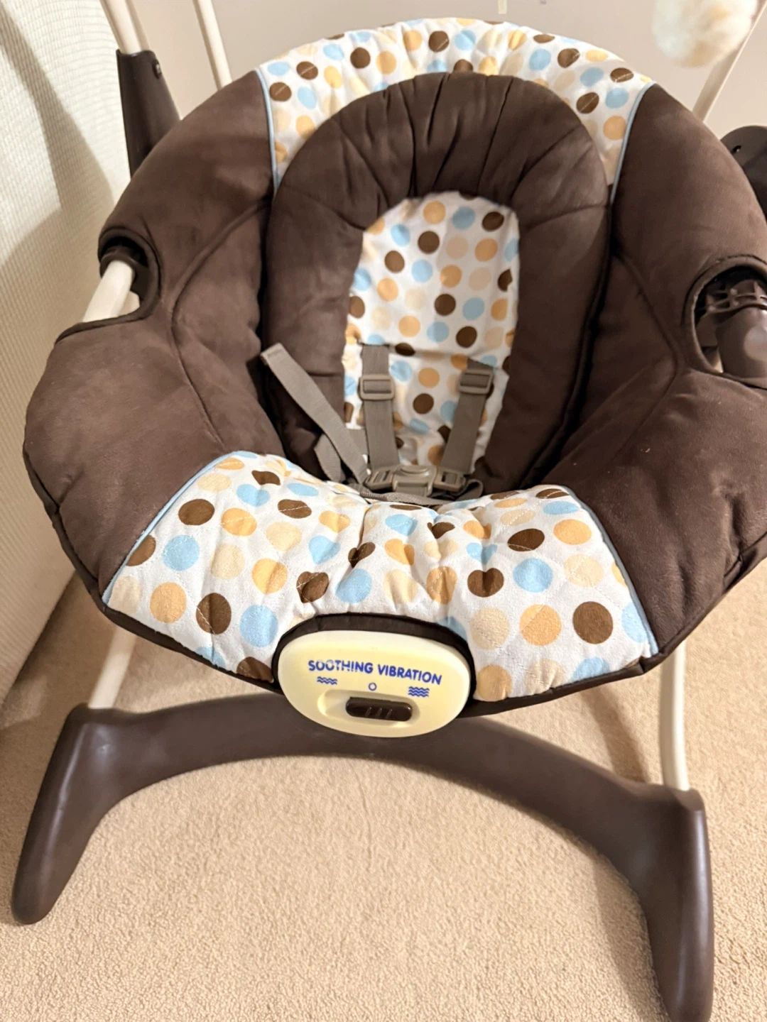 Selling a gently used baby swing! It features a soothing vibration function to help calm your little one. The swing is brown with a colourful polka dot pattern on the seat. It also comes with hanging toys to keep baby entertained