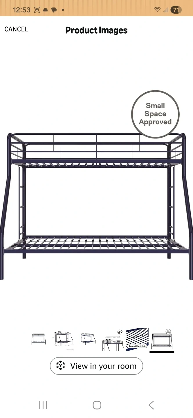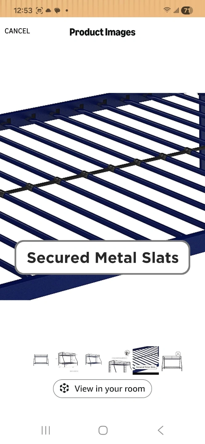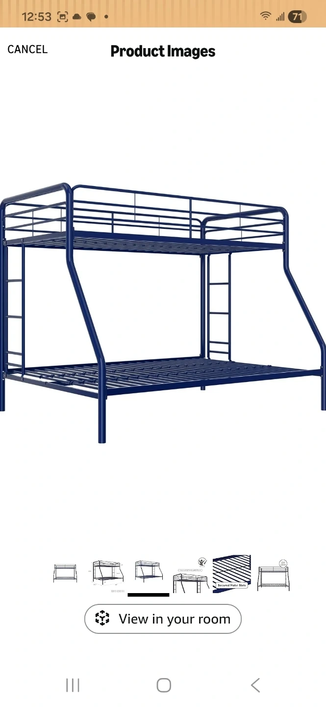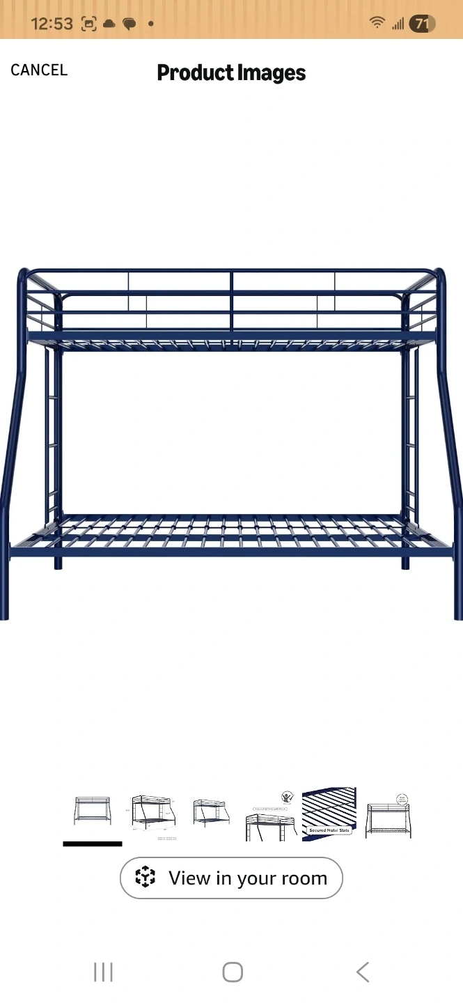 Selling a sturdy blue metal bunk bed frame! It features secured metal slats for support.