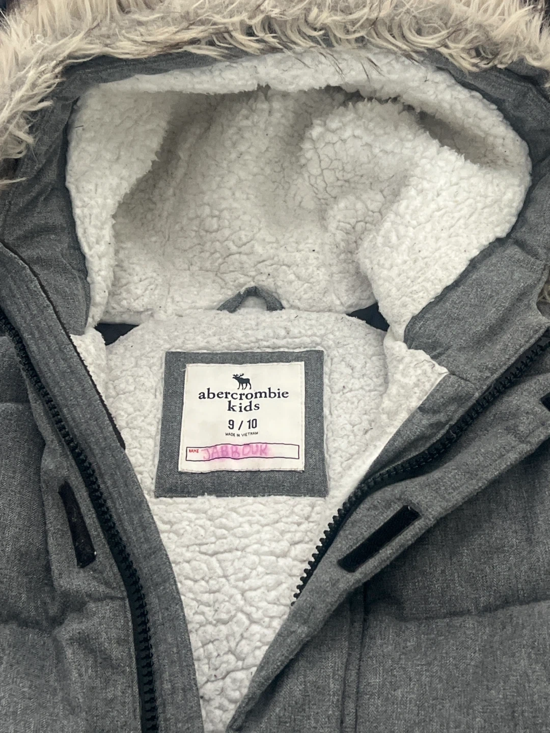 Selling an Abercrombie Kids puffer jacket in size 9/10! It's a stylish and warm jacket perfect for the colder months. The jacket features a cozy, fur-lined hood and a gray outer shell. It's in great condition and ready for a new owner!