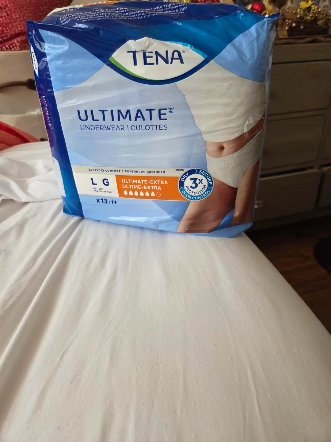 Selling packages of TENA (12) Ultimate Underwear Culottes in size Large (L). These are designed for everyday comfort and ultimate-extra protection with odour control. Package contains 13 pairs, fitting waist sizes 45-58 inches (114 cm-147 cm)