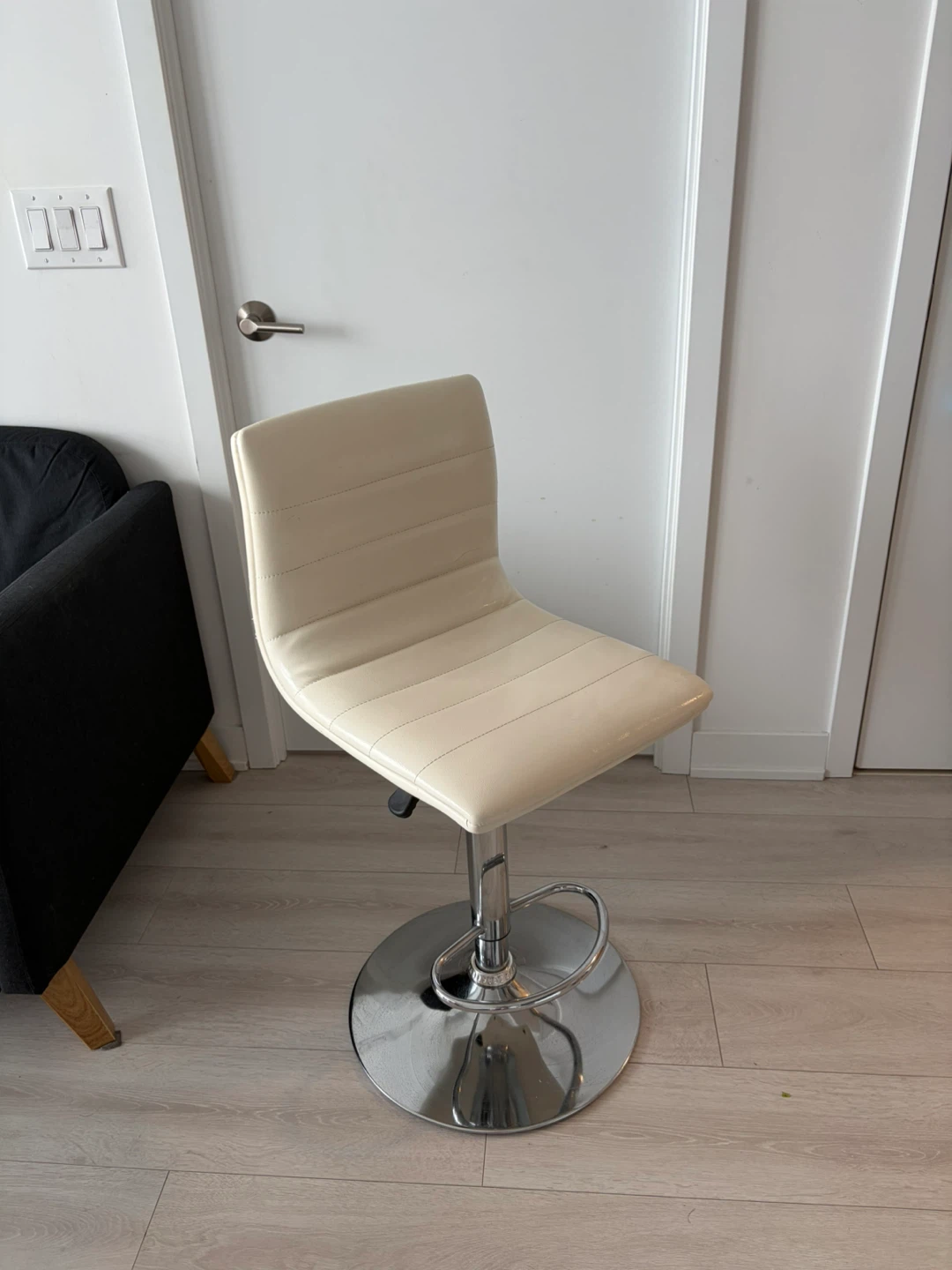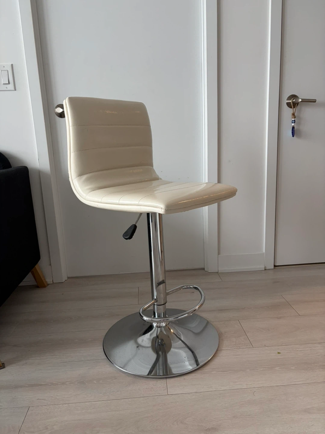 Selling 4 bar stools with adjustable height! It's in great condition and would look great in any kitchen or bar area. The seat is a nice cream colour and the base is chrome. It's very sturdy and comfortable to sit on