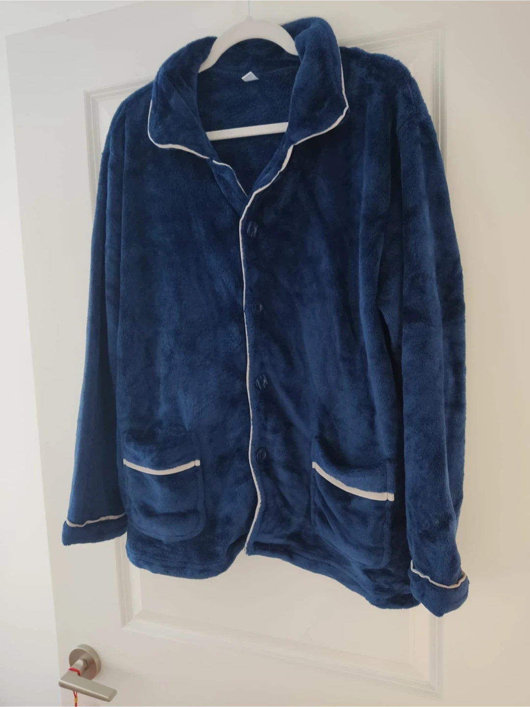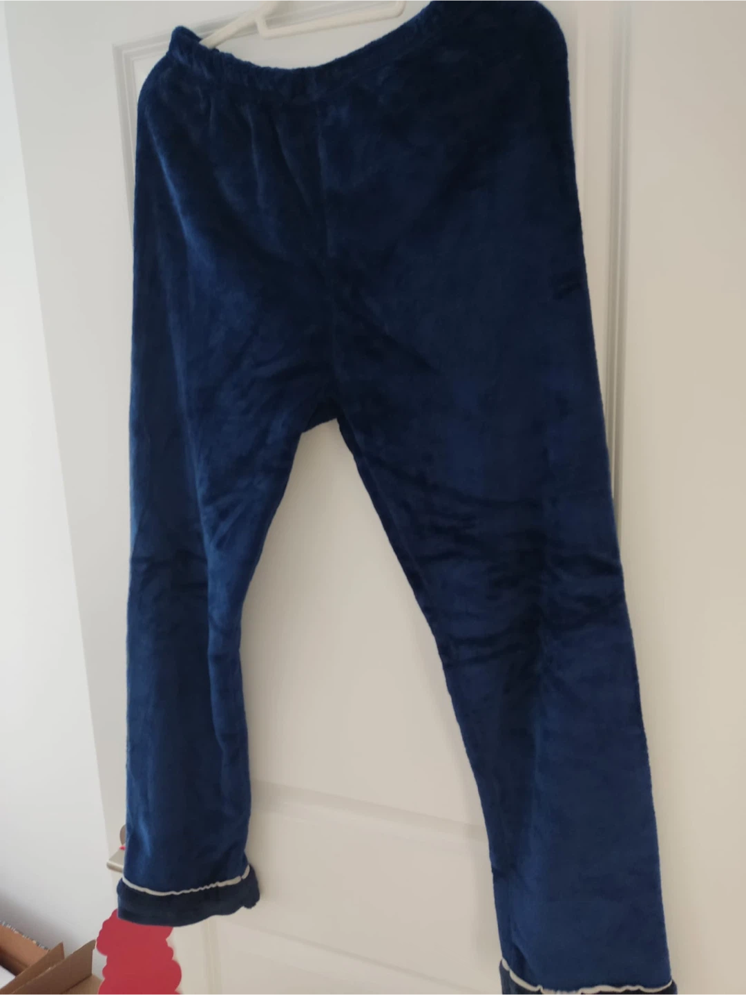 Cozy up with this comfy blue fleece pajama set! It's in great condition and perfect for those chilly nights. The set includes a button-down top and matching pants, both made of soft fleece material. It's a great set to relax in at home!
