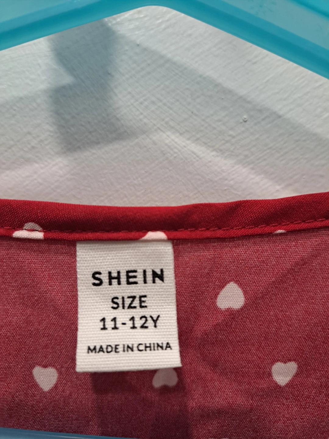 Selling a cute Shein blouse with a red background and white heart pattern! The size is 11-12Y.