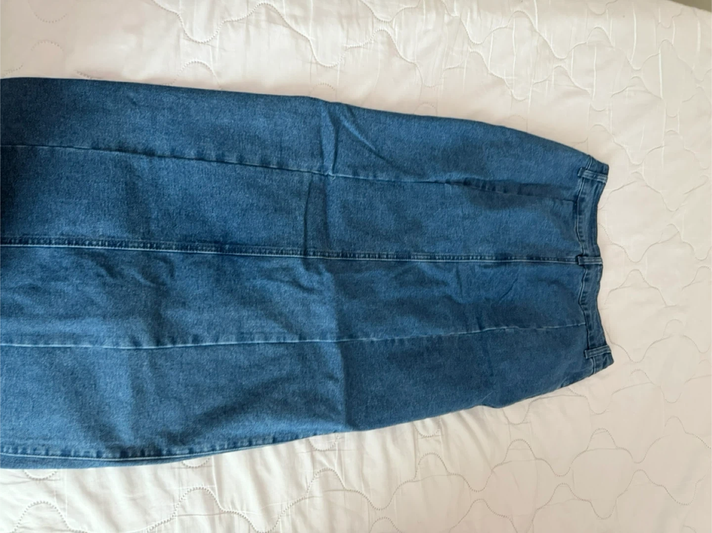 Here's a denim skirt that's in great condition! It's a classic piece that can be dressed up or down. Perfect for any occasion and definitely tall girl friendly!!