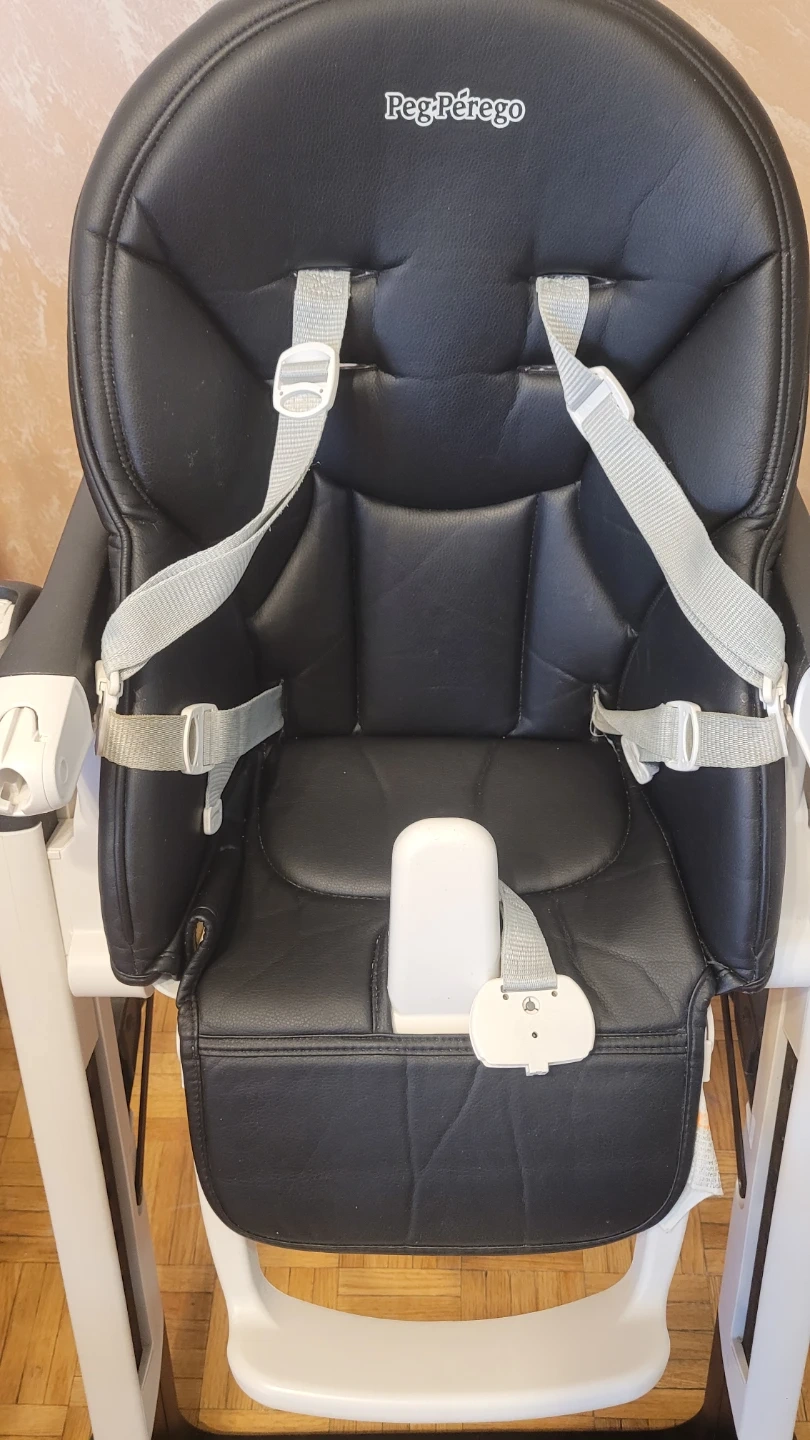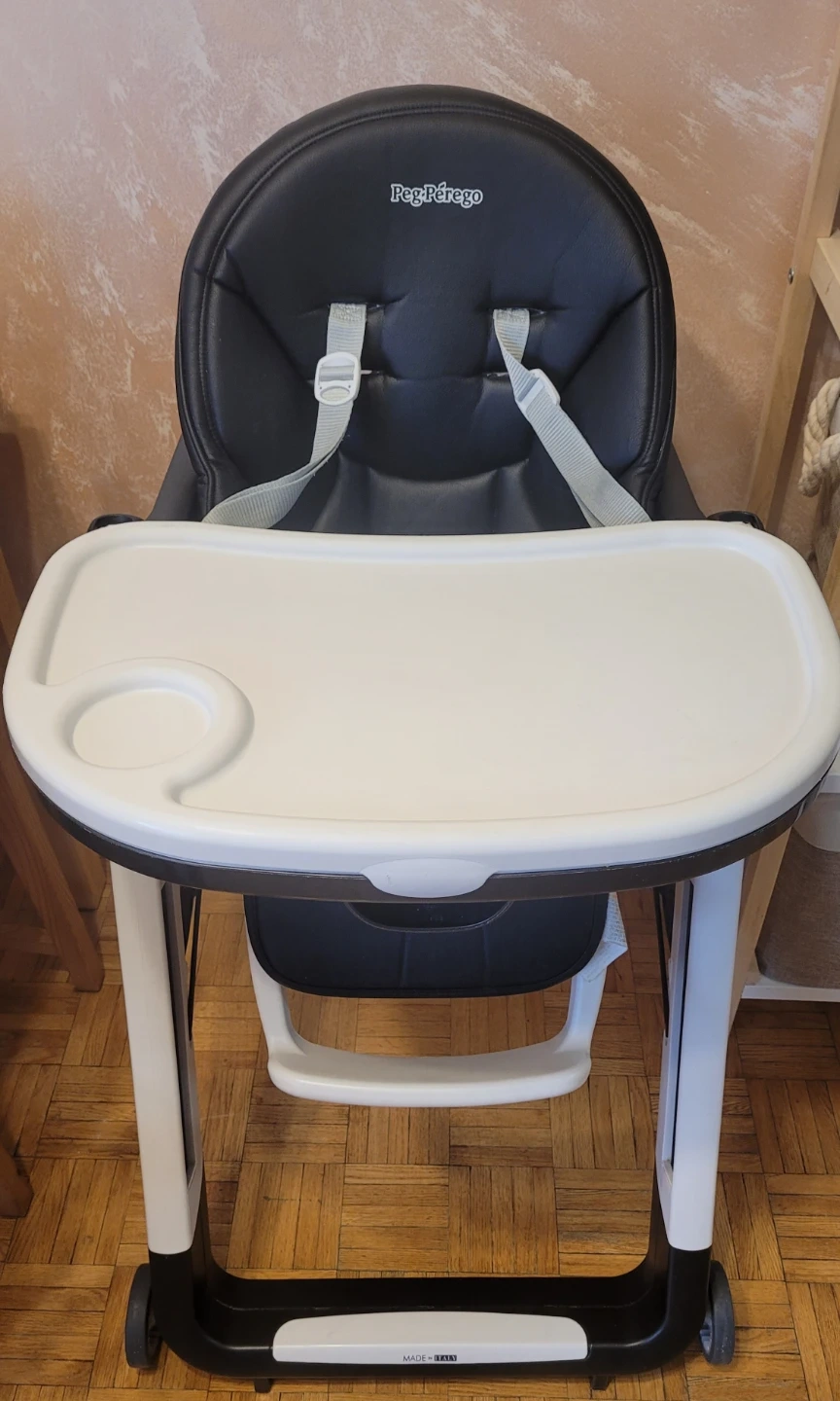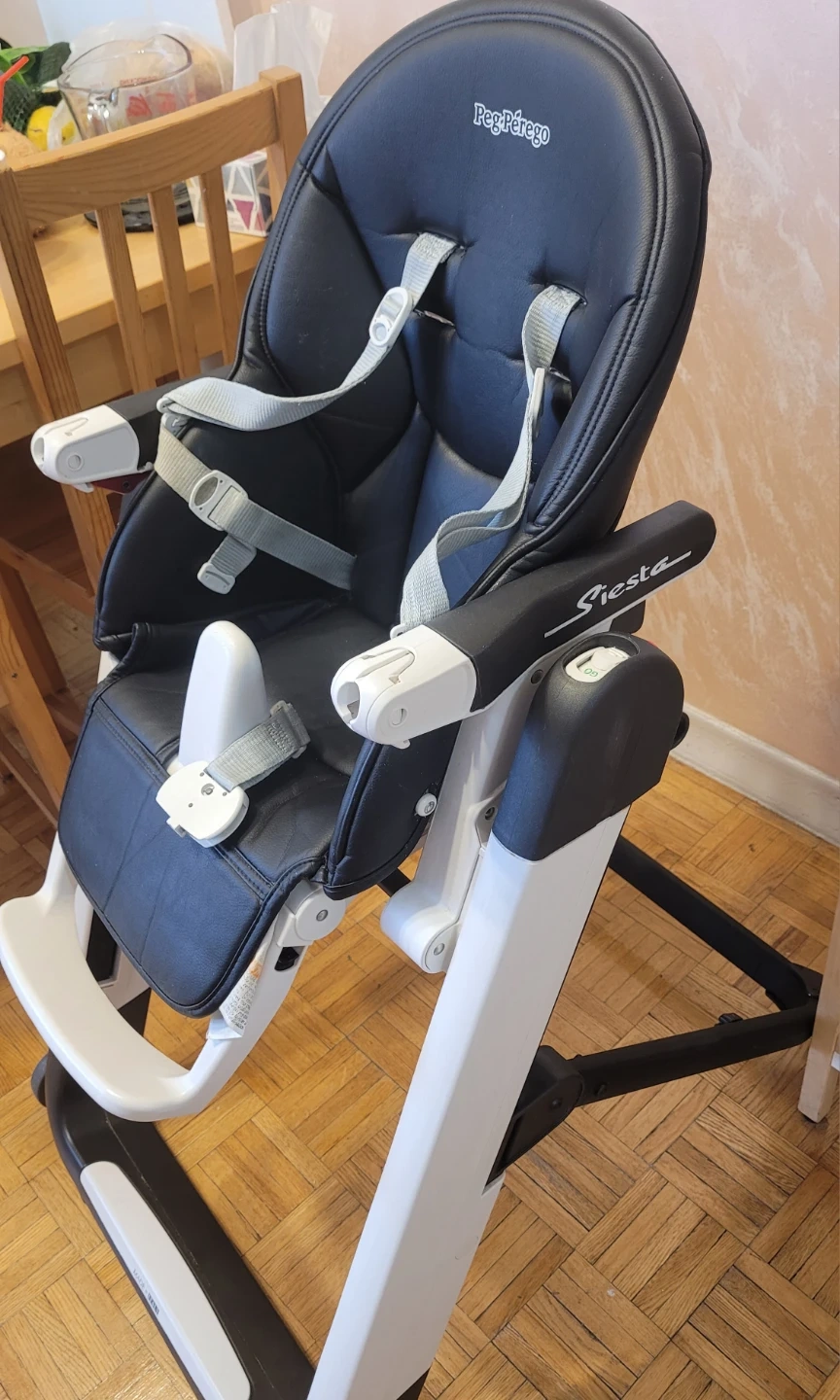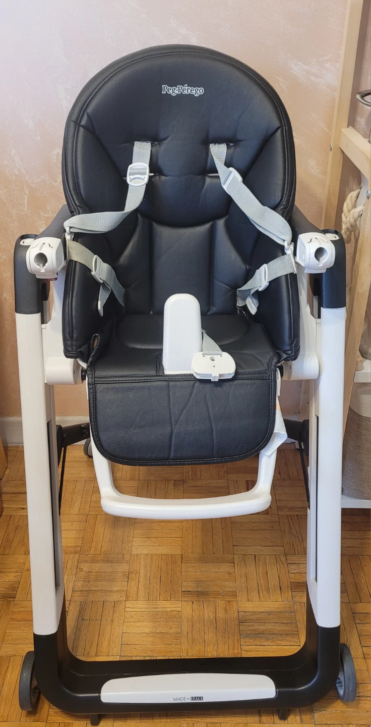Selling a Peg Perego Siesta high chair in black. It's in great used condition and ready for a new home! This chair is super convenient and easy to clean, making meal times a breeze. It has some light signs of wear as seen in pictures. Perfect for little ones starting solids!
