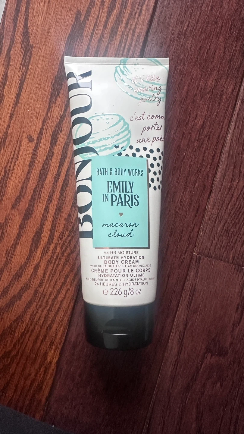 Selling a Bath & Body Works Emily in Paris Macaron Cloud lotion! It provides 24-hour moisture with shea butter and hyaluronic acid. The lotion is 226 g / 8 oz