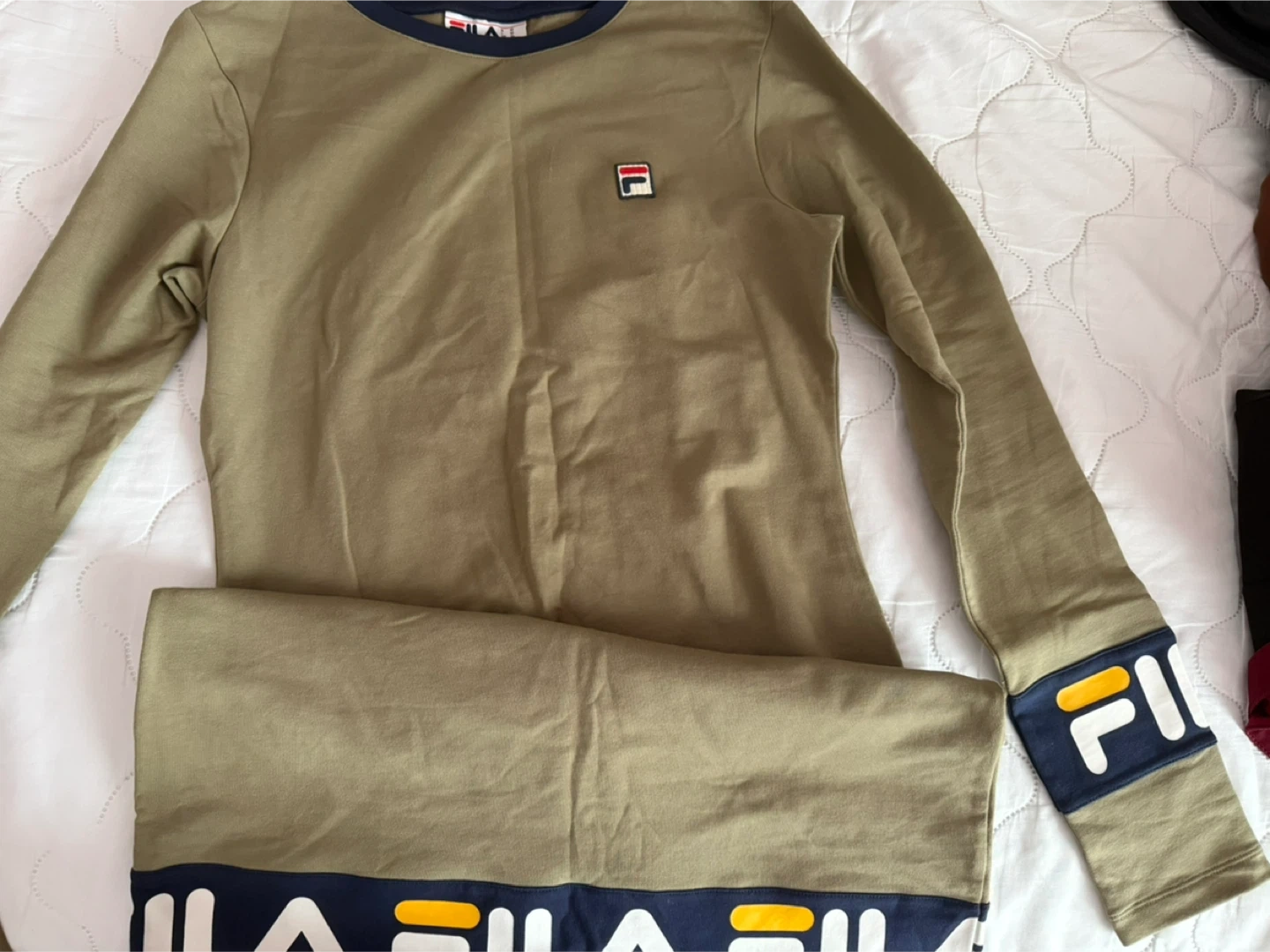 Selling a Fila long sleeve set in olive green! It's in great condition and perfect for lounging or casual wear. The set features the Fila logo on the sleeve and the bottom of the pants.