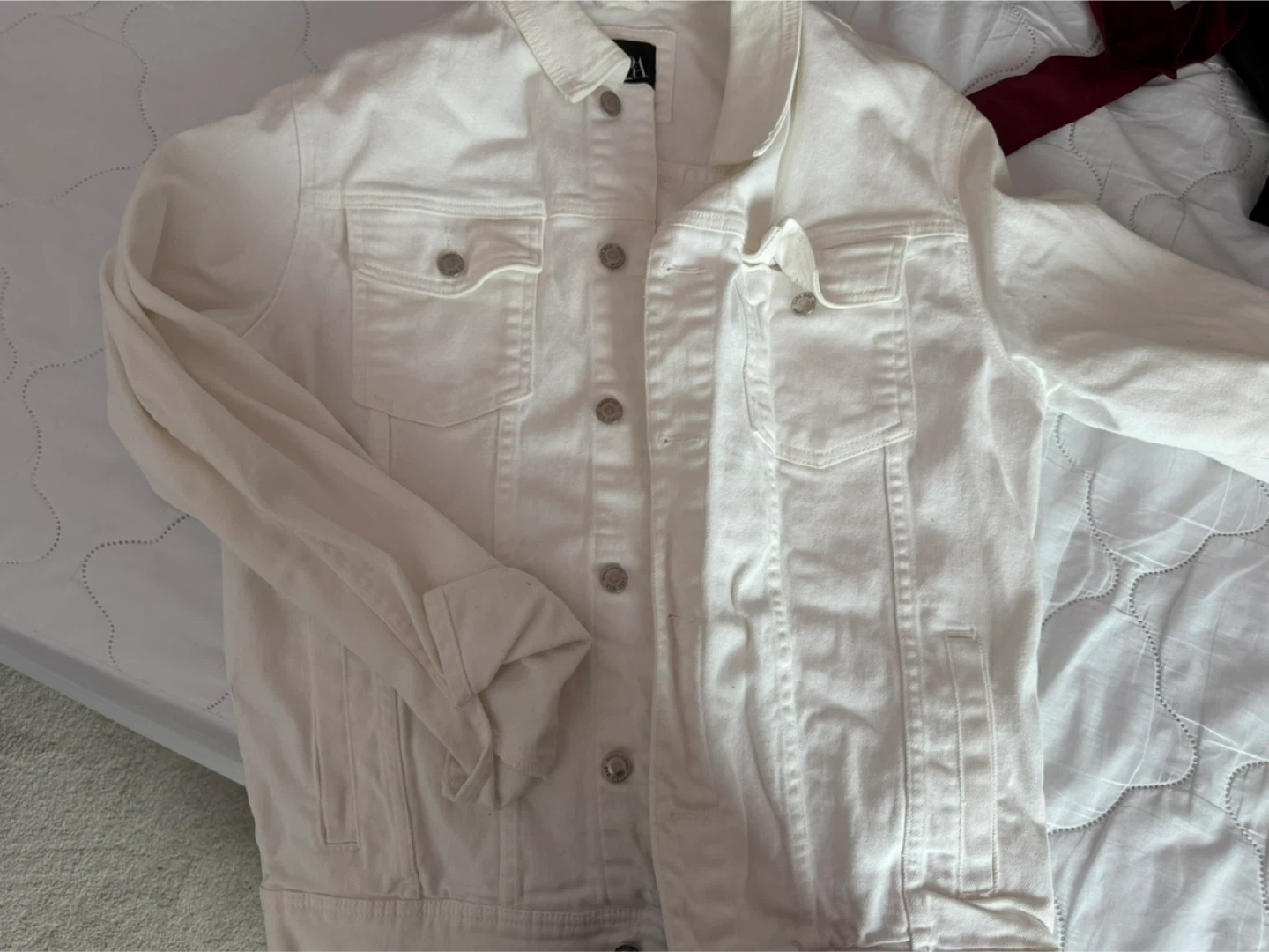 Selling a Zara white denim jacket. It's in great condition and perfect for layering! The material is a sturdy denim, and it features a classic button-down design. (For Men AND Women