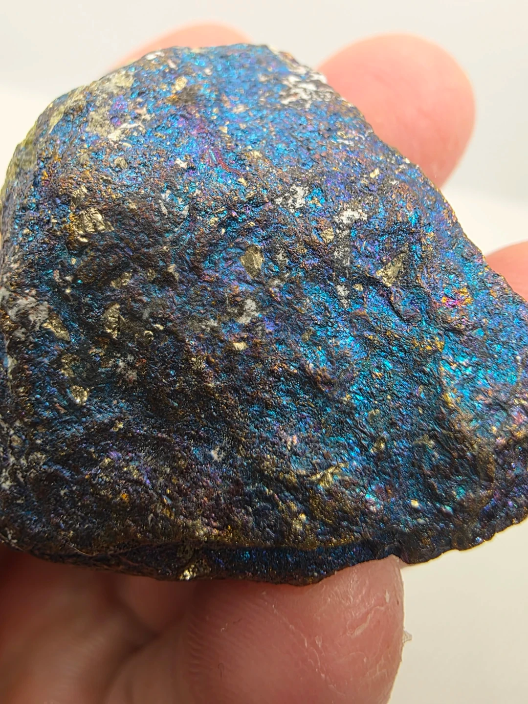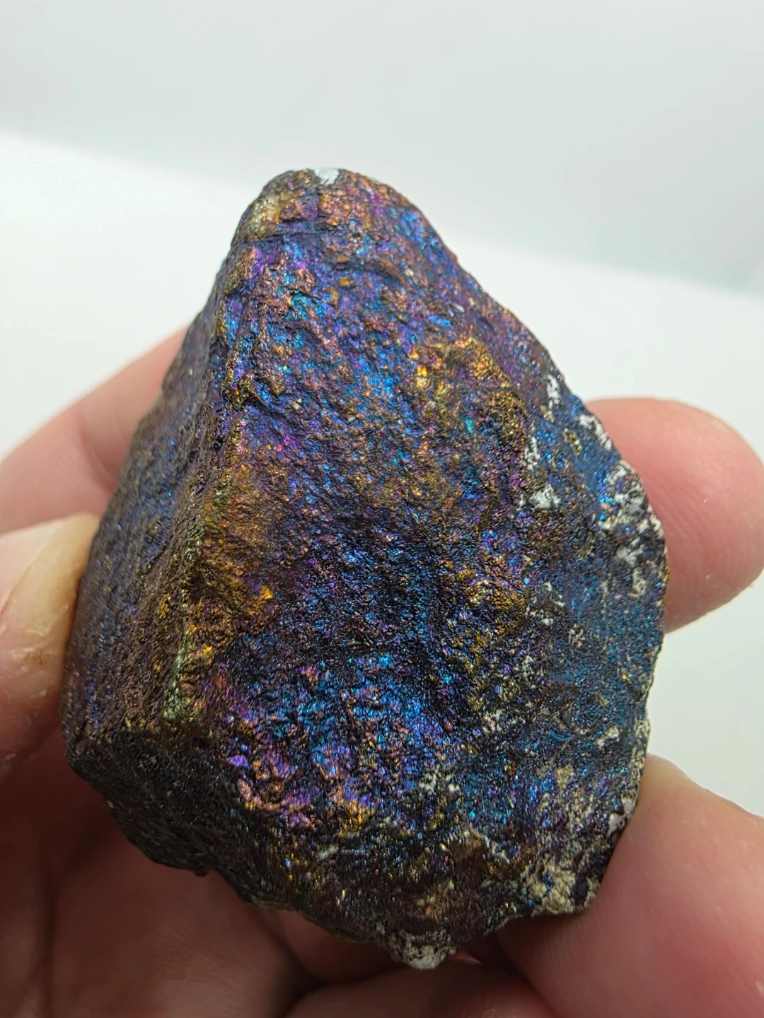 The object is a piece of bornite mineral, commonly known as "peacock ore" due to its distinctive iridescent tarnish.
