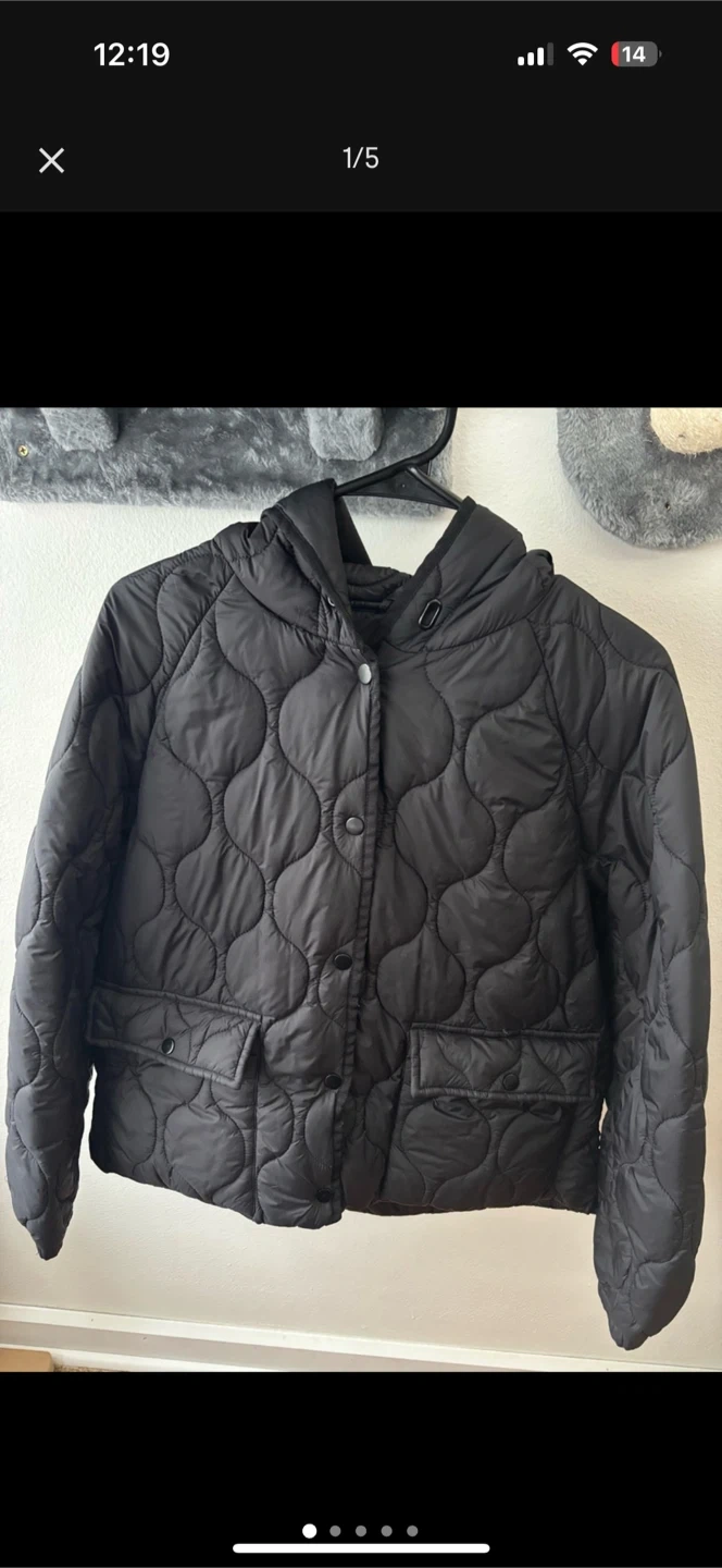 Here's a gently used black quilted puffer jacket, perfect for those cooler days! It features a stylish quilted design and is a size large. It's in great condition and ready for a new home!