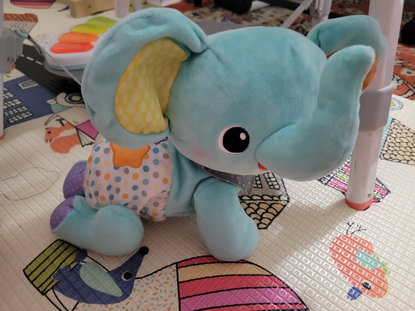 Here's a cute Fisher-Price Crawl After Elephant! The elephant is a soft, plush toy designed to encourage babies to crawl and explore. It's light blue with colourful accents and has a friendly face that babies will love!