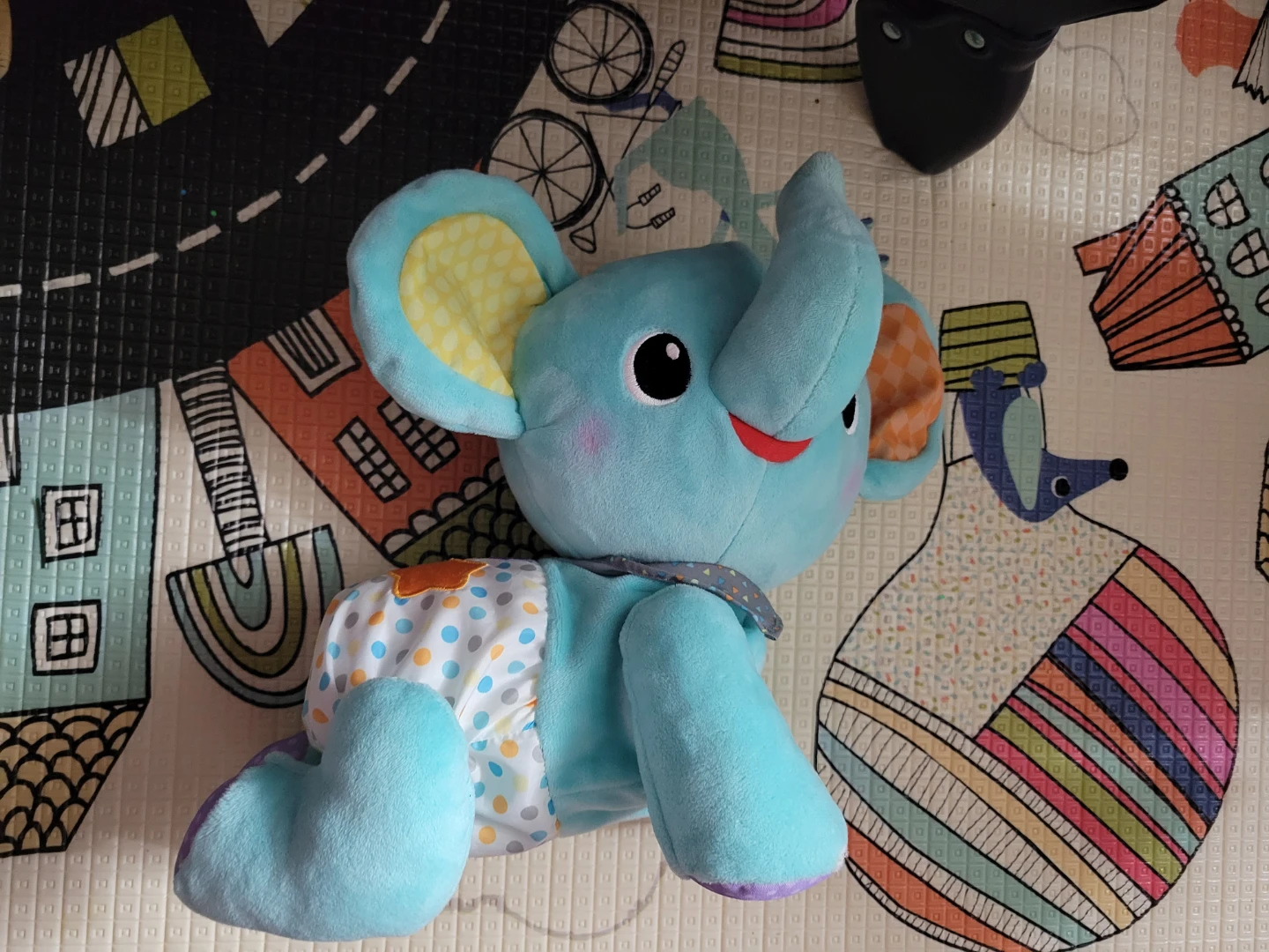 This is a VTech Explore & Crawl Elephant interactive plush toy. The toy encourages crawling and walking with ear-flapping movement and bright, light-up star. It plays over 45 songs, melodies, sounds, and phrases to teach colors and numbers. The soft, plush fabric features multiple textures and patterns for sensory stimulation.