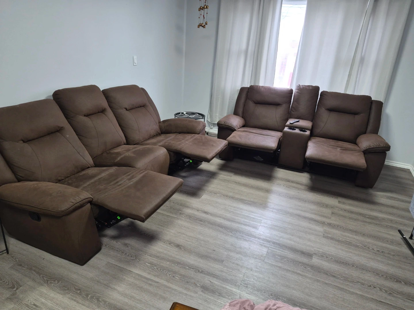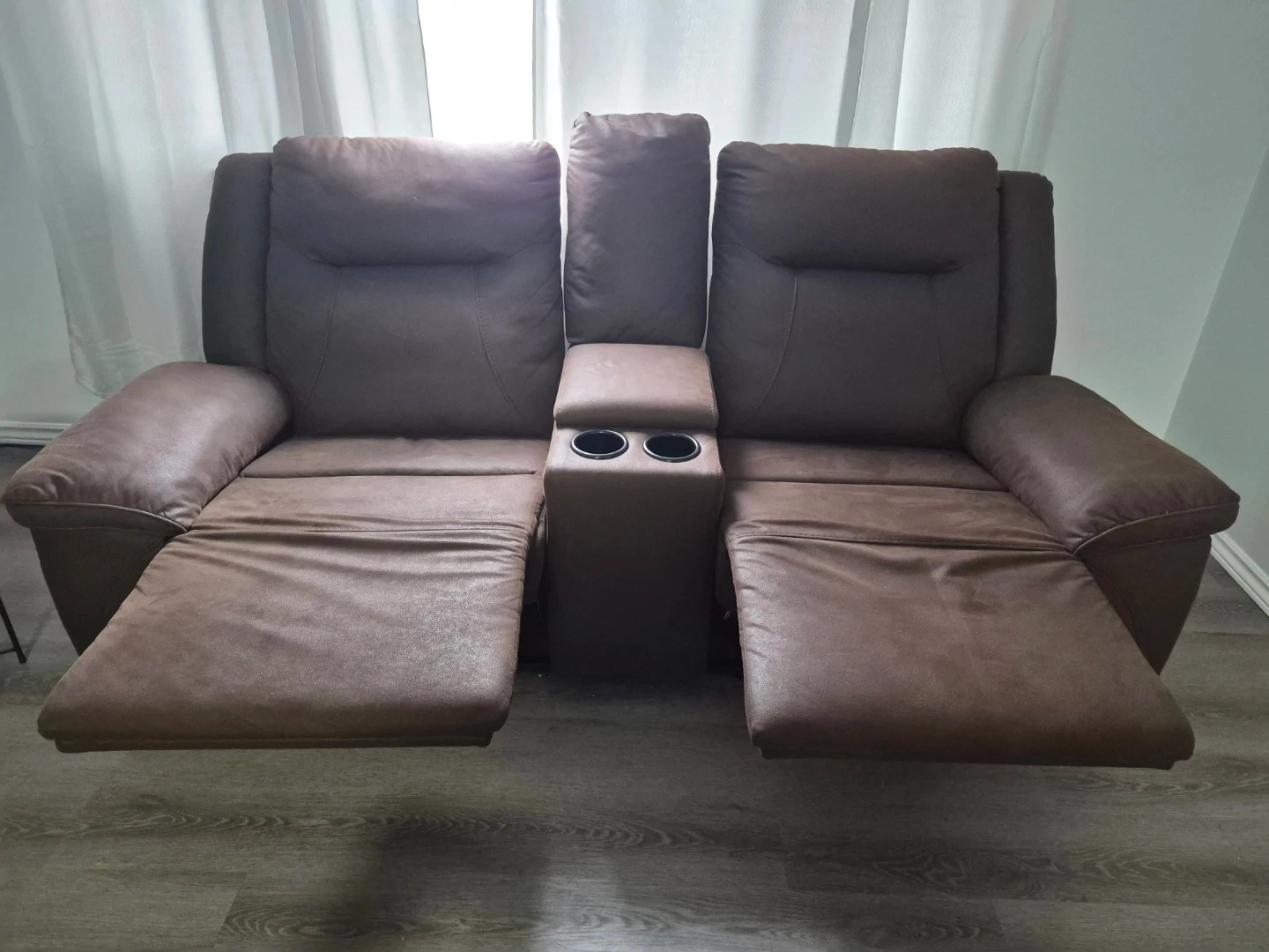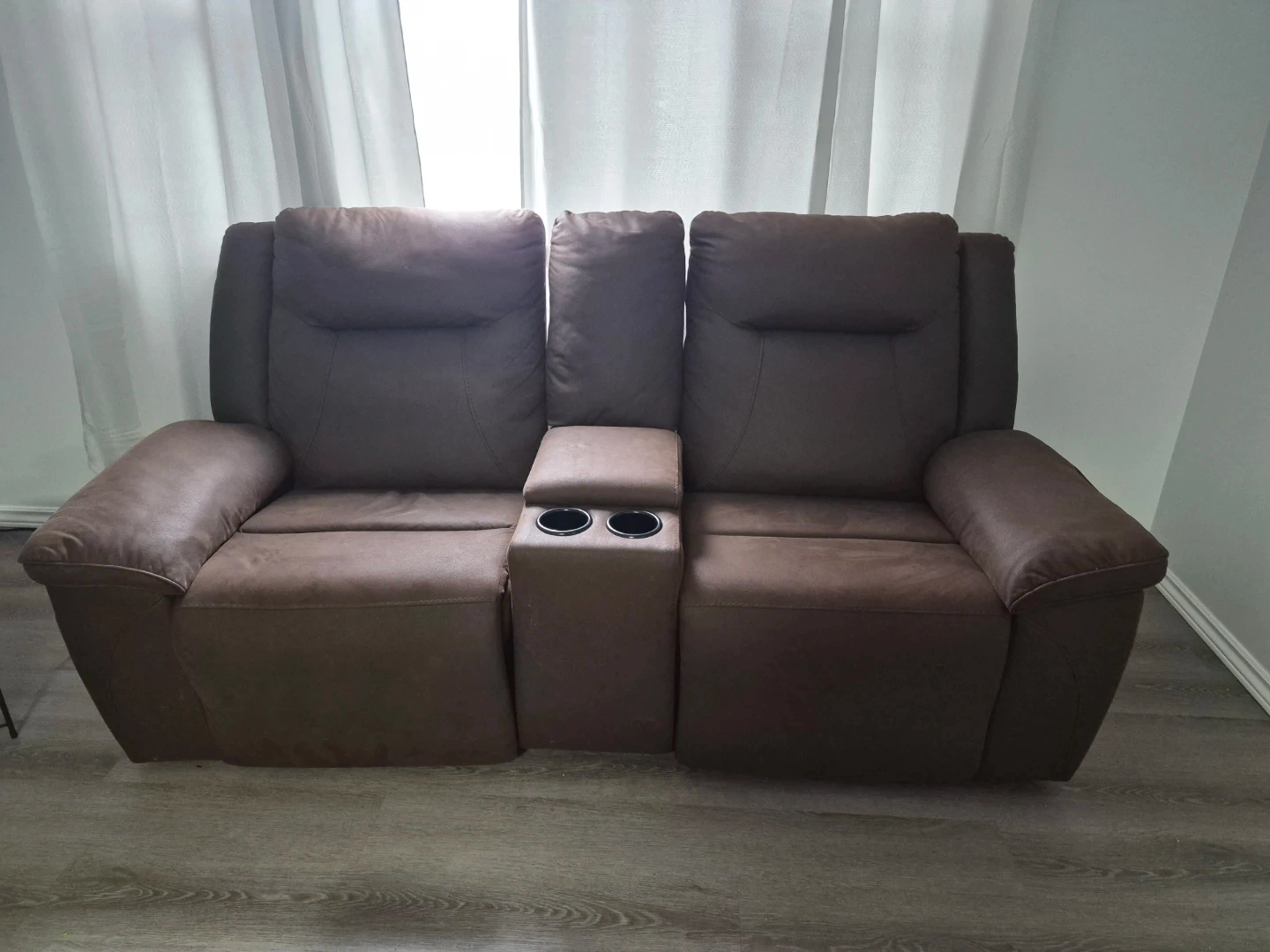 Selling a comfy brown reclining sofa set! Includes a 3-seater sofa and a loveseat with a centre console and cupholders.