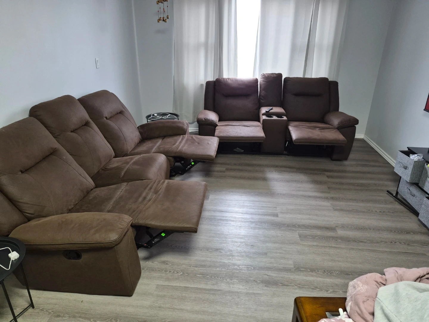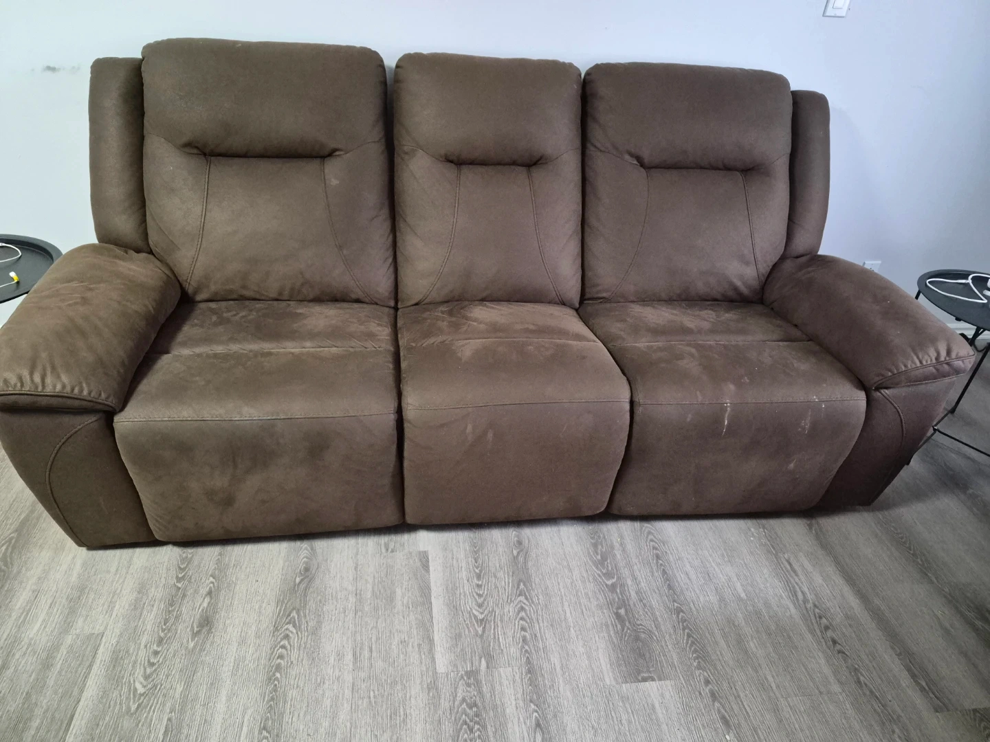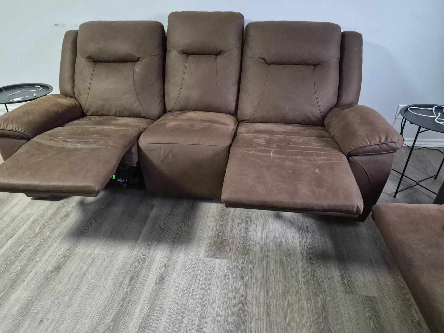 Selling a comfy brown reclining sofa set! Includes a 3-seater sofa and a loveseat with a centre console and cupholders.