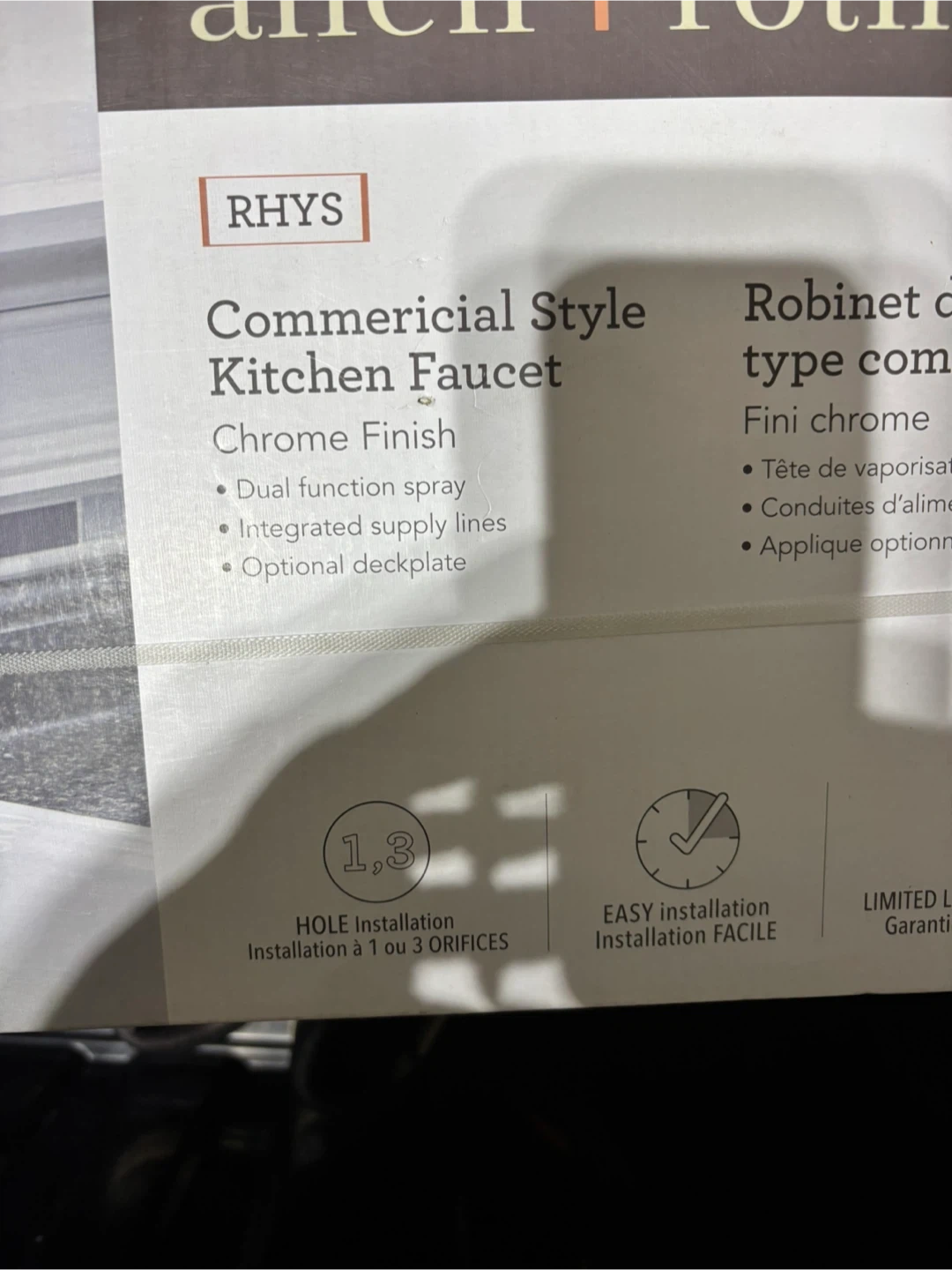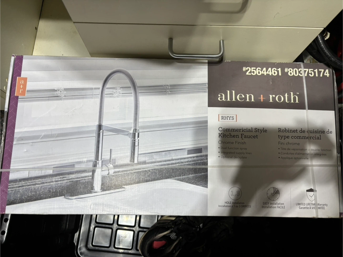 Selling a brand new Allen + Roth RHYS commercial style kitchen faucet with a chrome finish! It features a dual function spray, integrated supply lines, and an optional deckplate. Easy installation for 1 or 3 hole configurations. The box is included