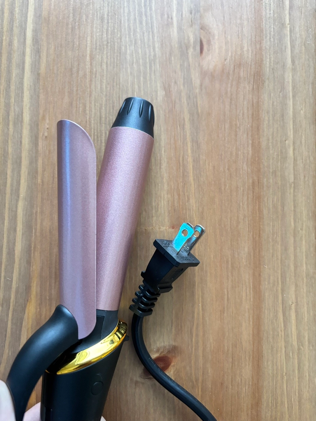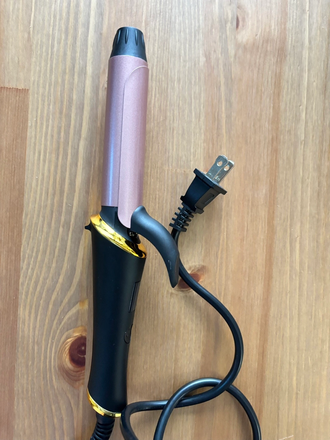 Selling a curling iron with a rose gold barrel and black handle. It comes with a digital display for temperature control and a storage bag. Used once