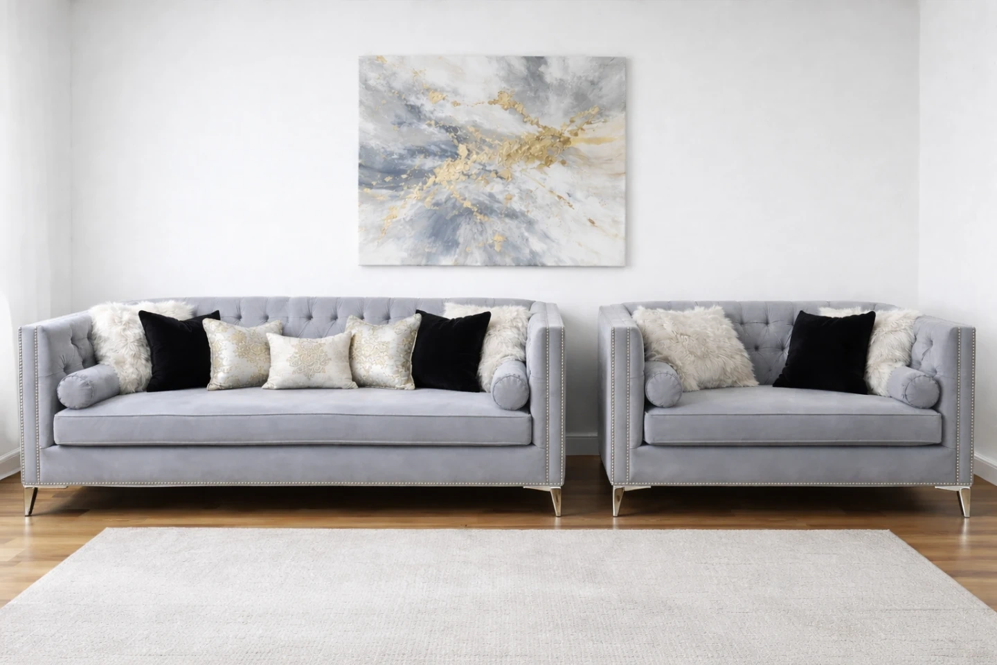 Elegant light-grey tufted velvet sofa set featuring one 3-seater and one 2-seater. Accented with sleek steel legs, silver nailhead trim, and premium throw pillows for a modern, upscale look. Clean, well-maintained, and barely used in a smoke- and pet-free home.