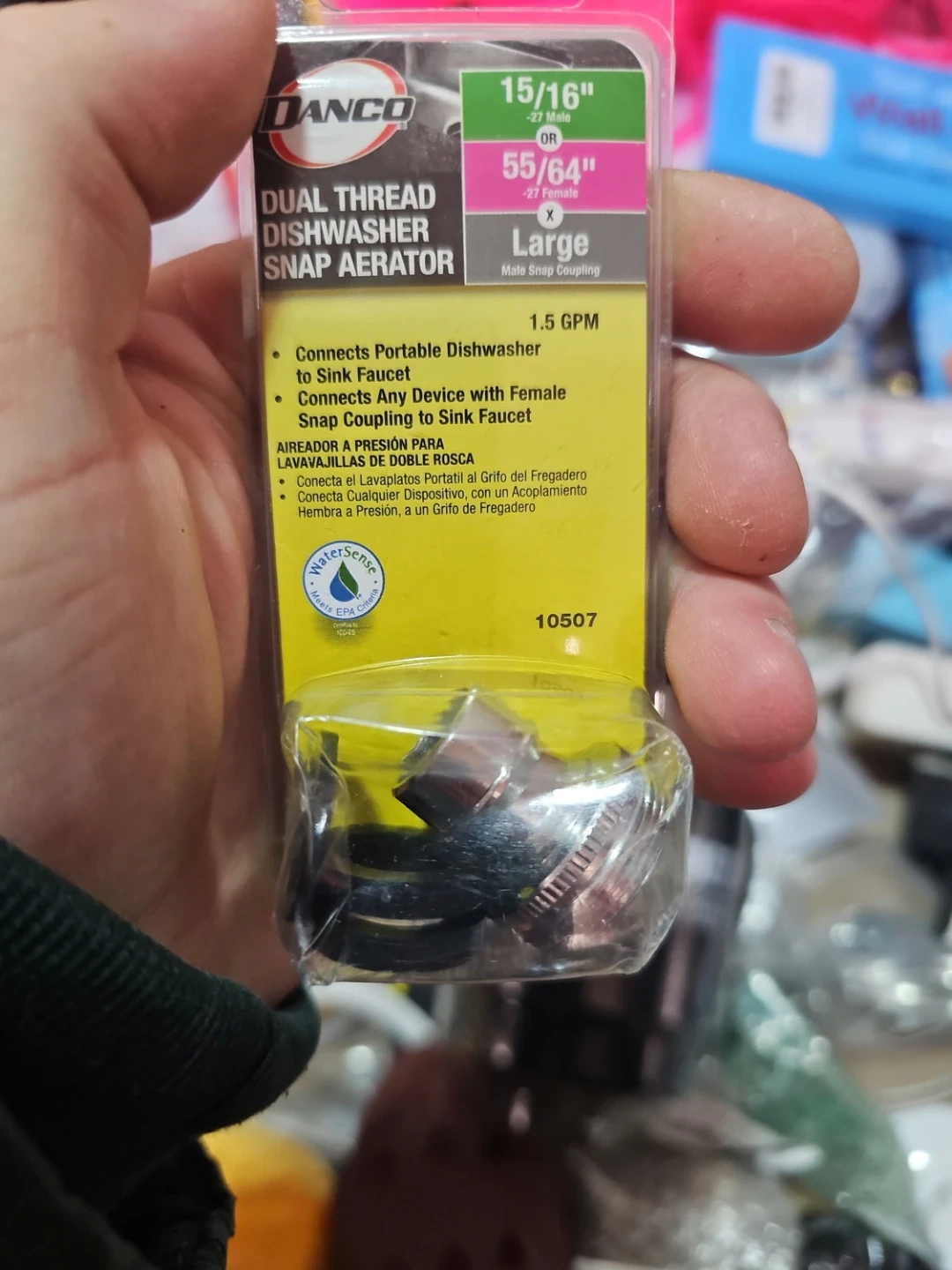 I'm selling a DANCO dual thread dishwasher snap aerator. It connects a portable dishwasher to a sink faucet and connects any device with a female snap coupling to a sink faucet. It is a large male snap coupling with 1.5 GPM.
