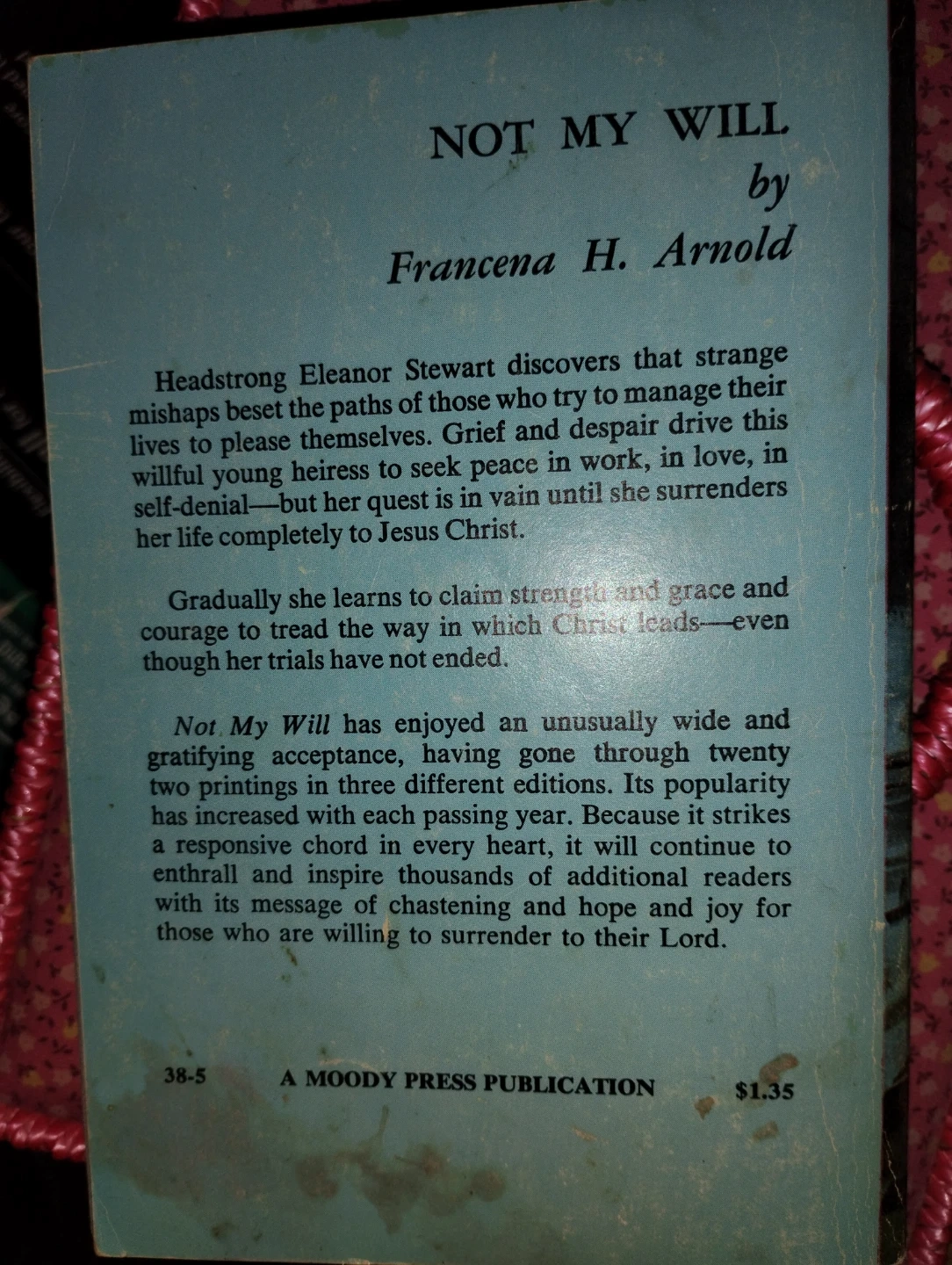 Selling "Not My Will" by Francena H. Arnold. It's a Moody Press publication. The book tells the story of Headstrong Eleanor Stewart and her spiritual journey. A great read for those who enjoy stories of faith and self-discovery