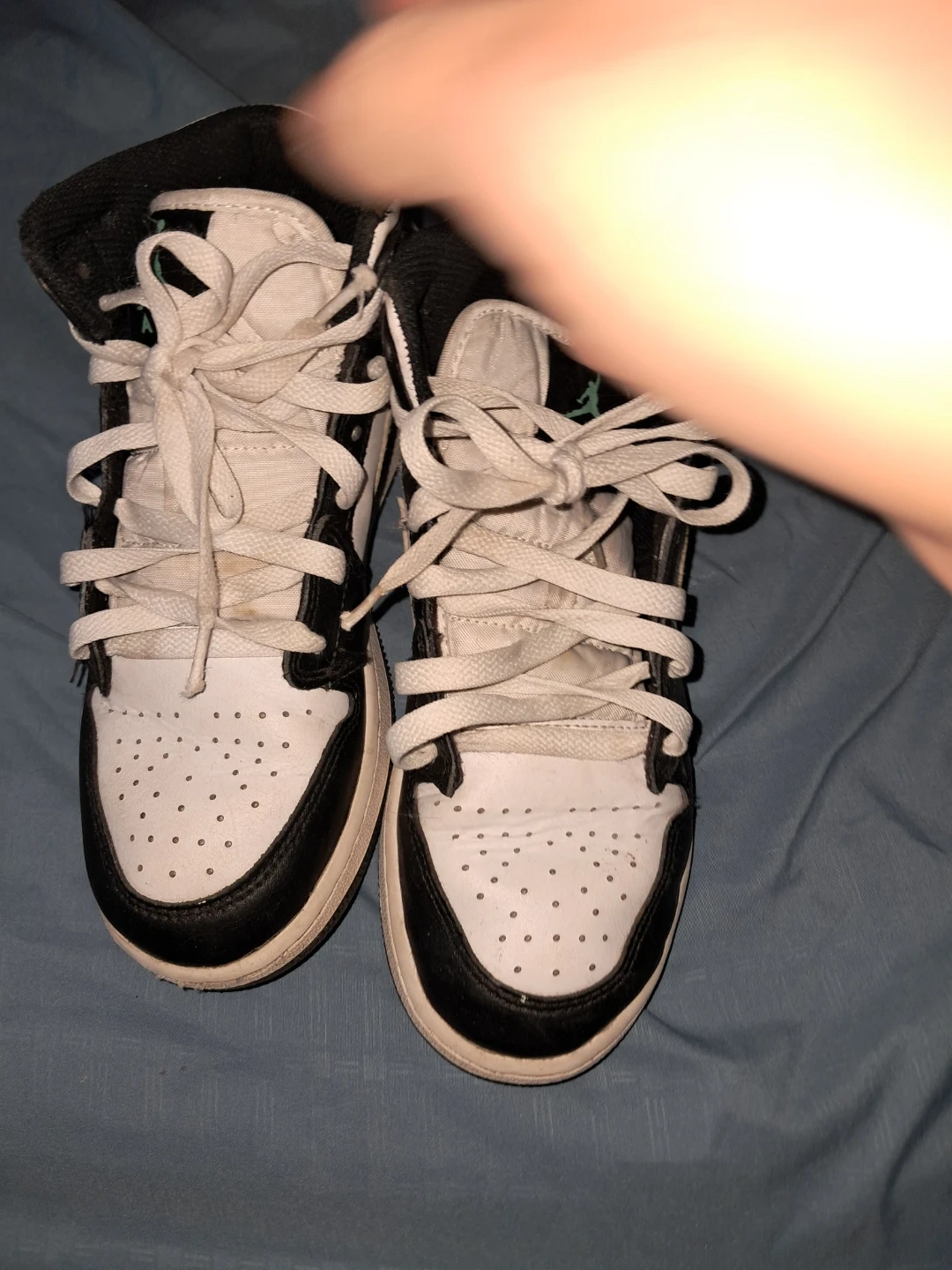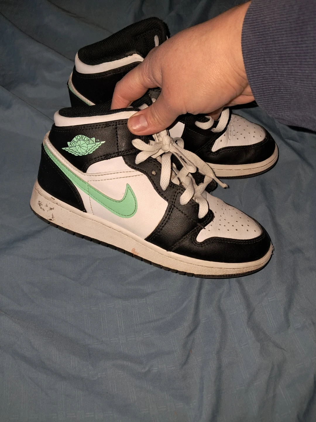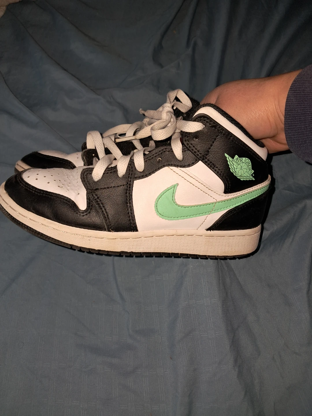 Selling a pair of Air Jordan 1 Mid SE sneakers in a youth size 6. They feature a black, white, and green colorway. These shoes have the iconic Air Jordan logo and design. Please check out the photos to see the condition!