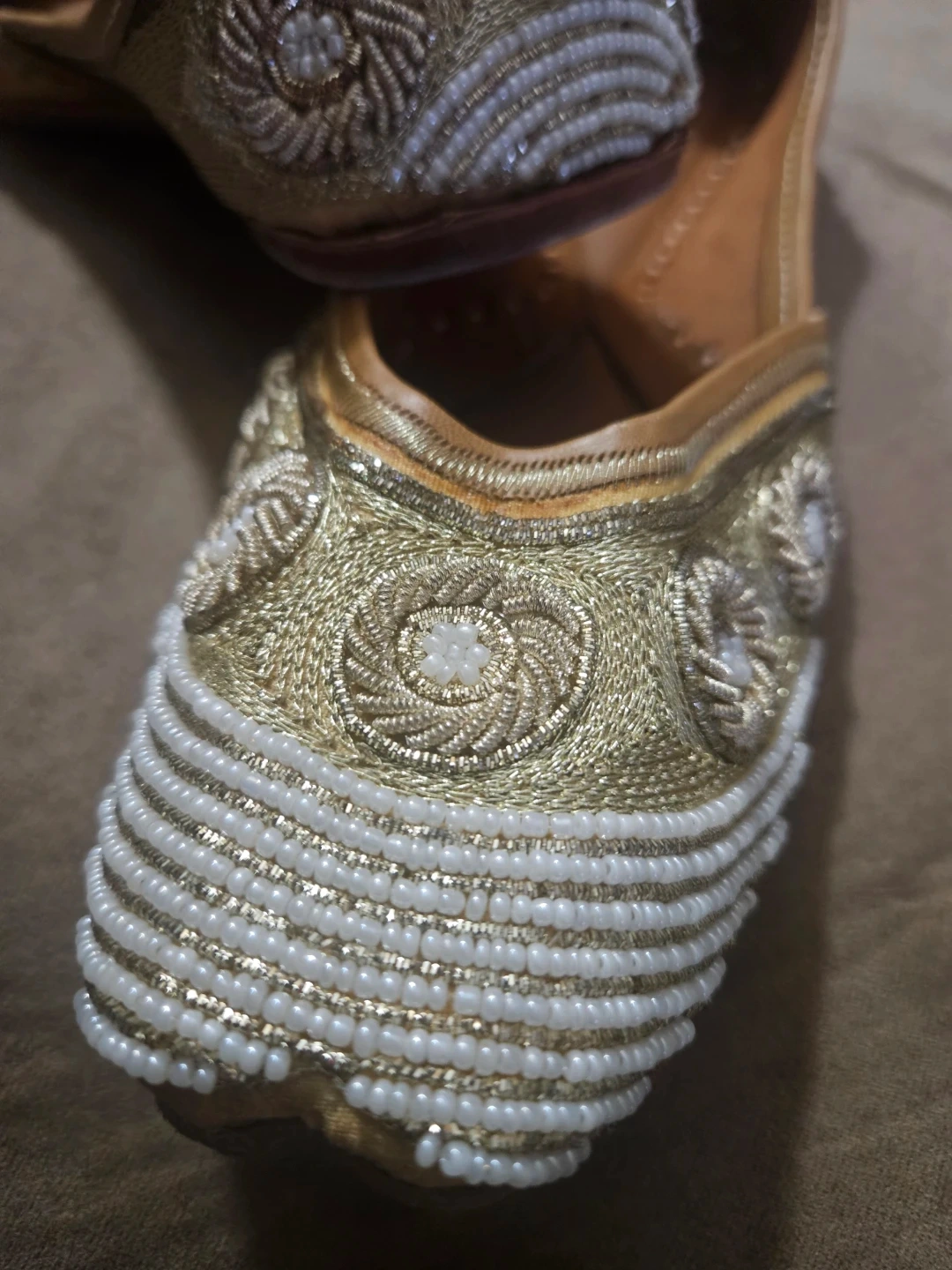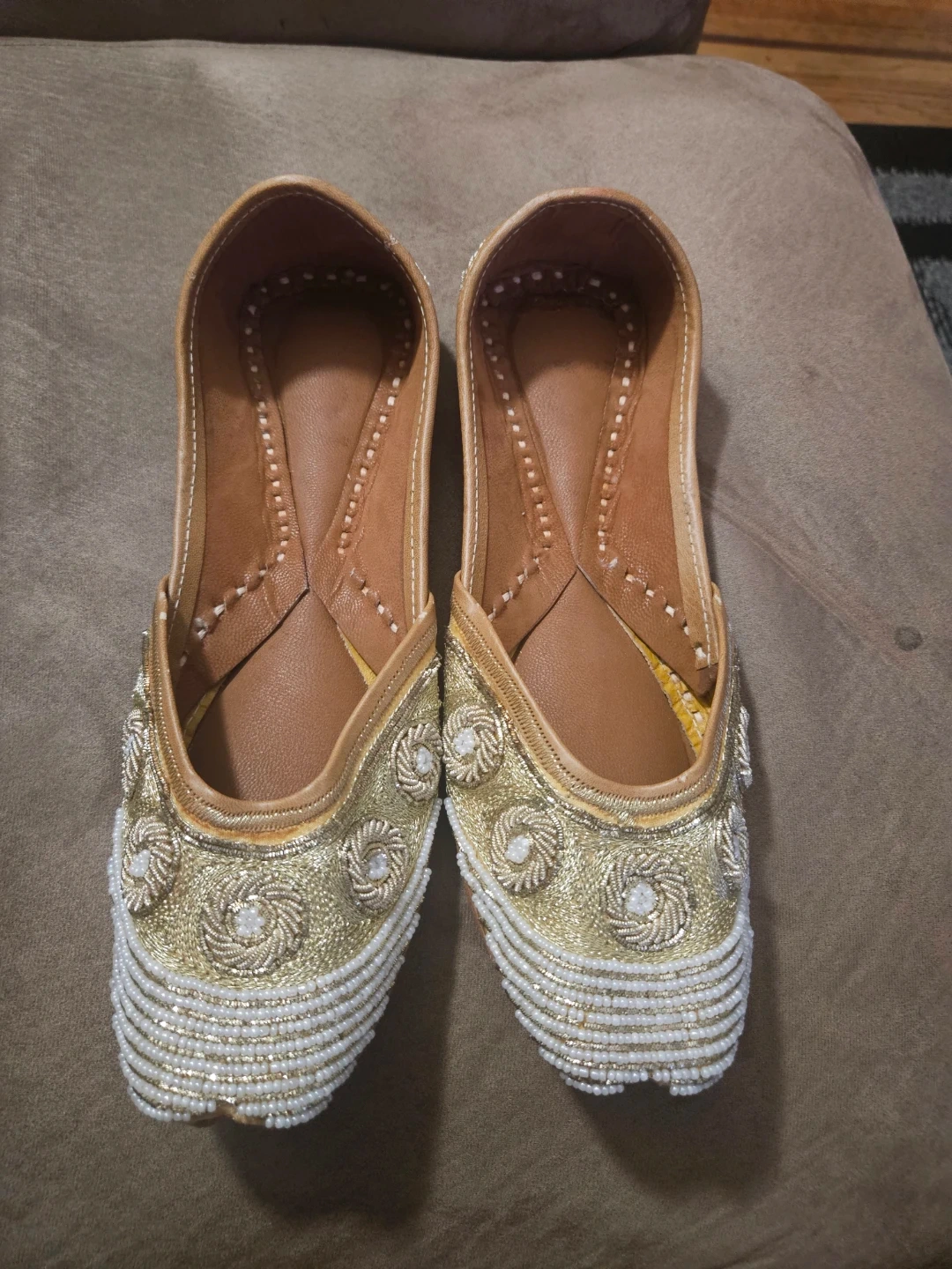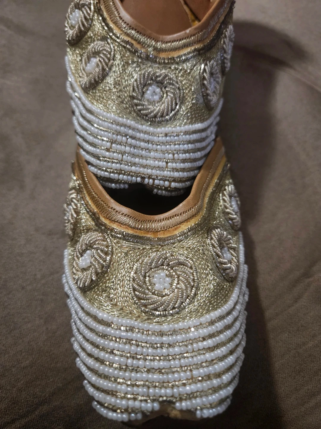 These are a pair of beautiful, embroidered jutti shoes! They are a size 6 and feature intricate embroidery and beadwork in gold and white. Perfect for adding a touch of elegance to any outfit